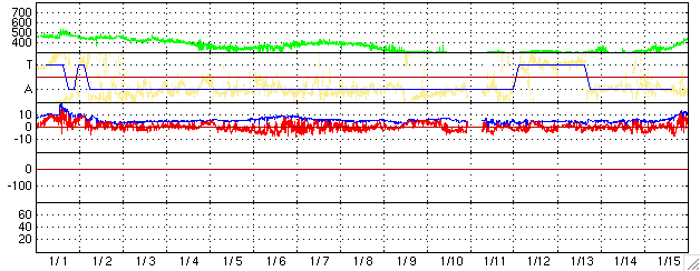 ACEが観測した太陽風の磁場(1番上の枠、白線は全体の強度、赤線は南北成分) および、太陽風の密度(3番目の橙線)、速度(4番目の黄線) (c) NOAA/SEC ![]() シベリアで観測された3日間の磁場データ 右側の3分の1が、昨日のデータになります。グラフが上がったり下がったりすると、オーロラ活動が活発化しています。 (c) NICT ![]() 27日の太陽周期に合わせたデータプロット (太陽風版) 太陽が同じ面を地球に向けていた27日前の変化から、今後を予想することができます。 (c) NICT