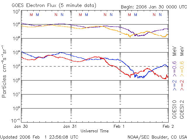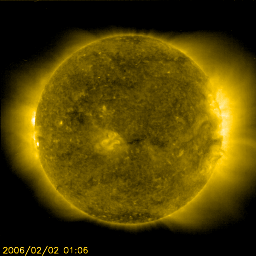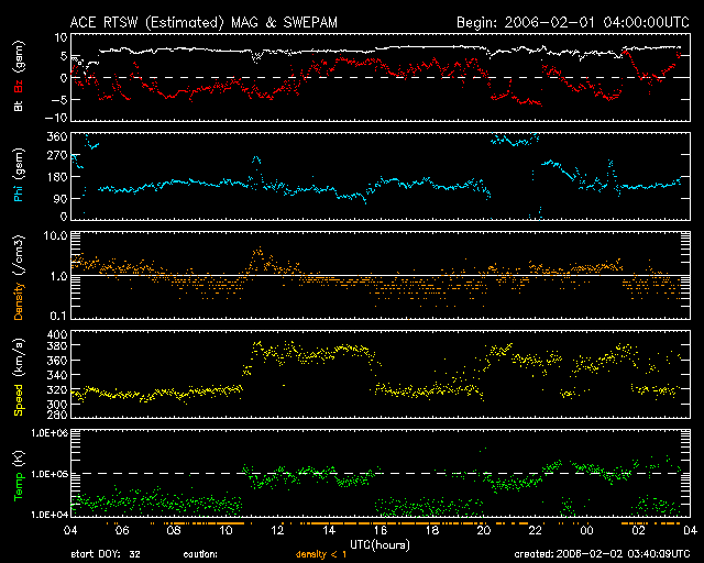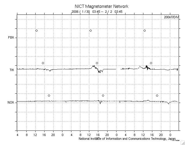 2006/ 2/ 2 12:47 更新 太陽風は低速ですが、磁場が乱れて小規模のオーロラ活動が発生しています。 担当 篠原 太陽風は低速状態を続けています(320〜370km/秒)。 ただし、太陽風磁場は6〜7nTに強まって、-5nT程度の南向きが続いたりする変動を見せています。 磁場の強まりと南北への乱れという性質は、ここの期間で以前より継続して見られている特徴です。 速度で見ると、目立った速度上昇もなく、概ね穏やかな部分なのですが、 磁場で見ると毎回強度の強まりが見られている、興味深い領域です。 南向き磁場の影響で、300nTくらいの小規模のオーロラ活動が発生しています(AE指数)。 シベリアの磁場データでは、小さな変化しか観測されていません。 これはオーロラ活動が見られた時間帯が、シベリアの夜中には当たらなかったためでしょう。 今後も、太陽風の磁場強度がやや上がっている間は、 南向き磁場に応じて小規模の乱れが発生するという状況が続くでしょう。 速度に目立った上昇が発生する事はないと思います。 このまま、やや低速の状態が続くでしょう。 このところ高いレベルを保っていた放射線帯の高エネルギー電子は、一気に密度を下げています。 小規模ですが磁気圏活動が活発になった影響だと思われます。 太陽のフレア活動はとても静穏です。 黒点は見られず、X線の強度は最低レベルに下がっています。 SOHO衛星のEIT284カメラの映像 (c) SOHO (ESA & NASA)