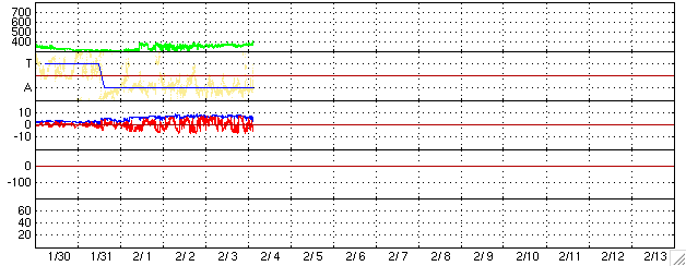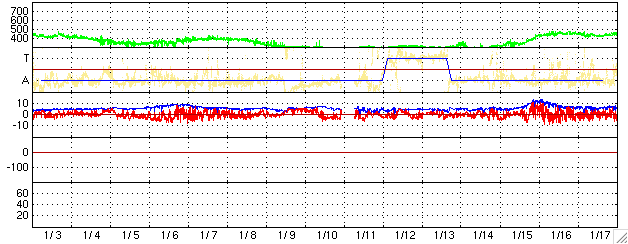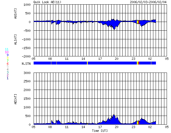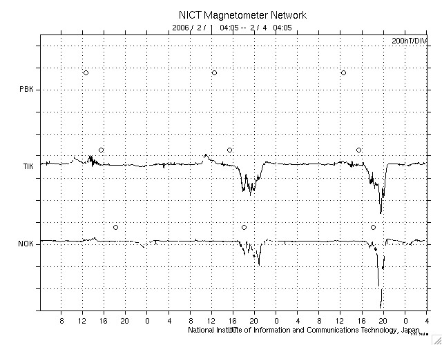 ACEが観測した太陽風の磁場(1番上の枠、白線は全体の強度、赤線は南北成分) および、太陽風の密度(3番目の橙線)、速度(4番目の黄線) (c) NOAA/SEC ![]() リアルタイムAE指数 下段のAEグラフの値が高くなると、オーロラ活動が活発化しています。 (c) 京都大学, NICT ![]() シベリアで観測された3日間の磁場データ 右側の3分の1が、昨日のデータになります。グラフが上がったり下がったりすると、オーロラ活動が活発化しています。 (c) NICT ![]() 27日の太陽周期に合わせたデータプロット (太陽風版) 太陽が同じ面を地球に向けていた27日前の変化から、今後を予想することができます。 (c) NICT