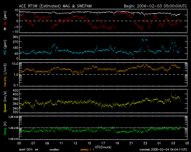 2006/ 2/ 4 13:05 更新 太陽風磁場の変動によって、小規模のオーロラ活動が発生しています。太陽はとても穏やかです。 担当 篠原 昨日のニュース以降も、太陽風磁場の強まりが続いていました。 磁場強度は8nT前後を保っていました。 南北成分も大きくゆったりと変化していて、 -5nT程度の南向きが2〜3時間続くという様な変化が何度も観測されています。 この影響で、小規模ですがオーロラ活動がたびたび発生しています。 AE指数のグラフ(宇宙天気ニュースでは久しぶりの登場です)では、 300〜500nTくらいの変化が観測されています。 活動が小規模なのは、太陽風の速度が360km/秒程度とやや遅めの状態にあるためです。 シベリア磁場データでも500nTの変化が観測されています。 ACEデータの最新の部分(図の右端)を見ると、磁場強度が5nTにやや下がっています。 過去の変化パターンを参考にすると、そろそろ太陽風磁場の強まりが終るのではないでしょうか。 太陽のフレア活動はとても穏やかな状態が続いています。 今日のX線のグラフには小さな変化が見えていますが、 これは本当に小さな点滅が太陽の東端(左端)付近で見られたためです。 SOHO EIT284の太陽写真で小さく明るく見えているあたりです。 この周辺は明るく見えていますので、そのうち小さな黒点群が姿を現すかもしれません。 いずれにせよ、太陽は引き続き穏やかな状態を続けるでしょう。 SOHO衛星のEIT284カメラの映像 (c) SOHO (ESA & NASA)