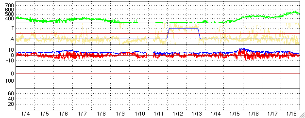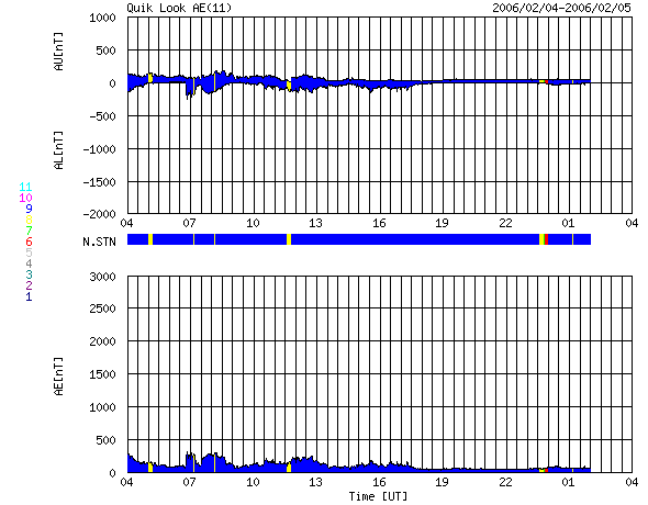 ACEが観測した太陽風の磁場(1番上の枠、白線は全体の強度、赤線は南北成分) および、太陽風の密度(3番目の橙線)、速度(4番目の黄線) (c) NOAA/SEC ![]() リアルタイムAE指数 下段のAEグラフの値が高くなると、オーロラ活動が活発化しています。 (c) 京都大学, NICT ![]() シベリアで観測された3日間の磁場データ 右側の3分の1が、昨日のデータになります。グラフが上がったり下がったりすると、オーロラ活動が活発化しています。 (c) NICT ![]() 27日の太陽周期に合わせたデータプロット (太陽風版) 太陽が同じ面を地球に向けていた27日前の変化から、今後を予想することができます。 (c) NICT