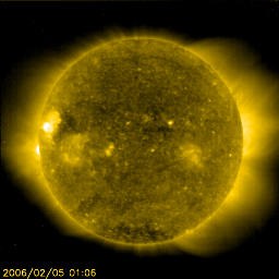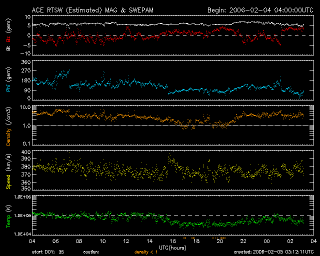 2006/ 2/ 5 12:13 更新 太陽風磁場の強度が下がり、磁気圏は一段と穏やかになっています。太陽では、無黒点が続いています。 担当 篠原 太陽風磁場強度の強まりは終わり、磁場強度は5nTに下がっています。 南向きへの変動も小幅になり(-2〜-3nT)、磁気圏への影響もより小さくなっています。 速度は380km/秒前後でこれまでよりいくらか上がっていますが、 通常レベルといえるくらいの速度です。 オーロラの活動度を示すAE指数のグラフでは、200nTくらいの小さな変化が見えている程度で、 磁気圏は一段と穏やかになっています。 27日周期の図を見ると、現在の弱い速度の盛り上がりは、 前周期にも見られていたことが分かります(1月7〜8日)。 これも今日くらいで終わり、その後は低速になり、5日くらいとても穏やかな状態が続きそうです。 SOHO EIT284の太陽写真でも、太陽はぼんやりと濃淡のない姿に見えていて、 目立ったコロナホールは無く、この写真でも今後の穏やかな太陽風が予想できます。 太陽のフレア活動もまた、とても穏やかです。 暗いコロナホールが見られない様に、明るい活動領域もまたほとんど現れてないためです。 X線のグラフは最低レベルに下がったままです。 SOHO衛星のEIT284カメラの映像 (c) SOHO (ESA & NASA)