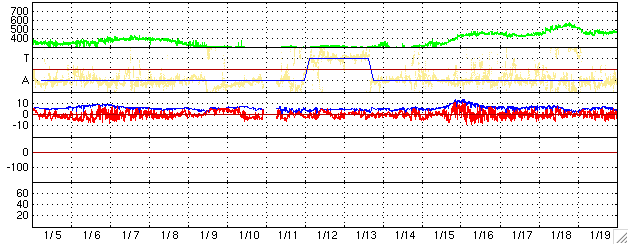 ACEが観測した太陽風の磁場(1番上の枠、白線は全体の強度、赤線は南北成分) および、太陽風の密度(3番目の橙線)、速度(4番目の黄線) (c) NOAA/SEC ![]() リアルタイムAE指数 下段のAEグラフの値が高くなると、オーロラ活動が活発化しています。 (c) 京都大学, NICT ![]() 27日の太陽周期に合わせたデータプロット (太陽風版) 太陽が同じ面を地球に向けていた27日前の変化から、今後を予想することができます。 (c) NICT