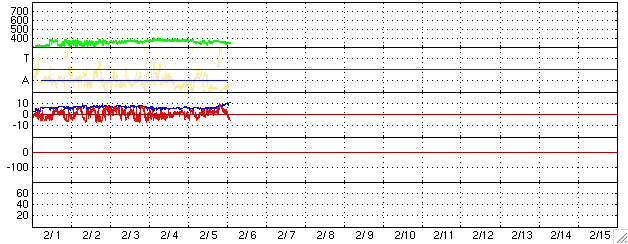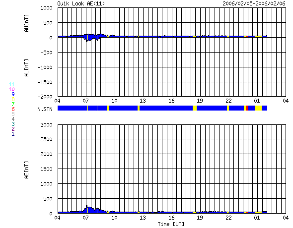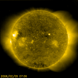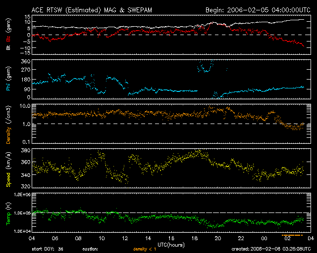 2006/ 2/ 6 12:27 更新 太陽風の磁場が強まり(10nT)、南向きも強まっています。磁気圏活動がある程度活発化しそうです。 担当 篠原 太陽風が興味深い変化を始めています。 今朝早く、6日3時(世界時5日18時)ころから徐々に磁場強度(白線)が強まり始め、 5nTから10nTに上がりました。 現在も強まる傾向は続いています。 そして、南北成分(赤線)を見ると、初めは北向き(プラス方向)に白線とともに強まっていましたが、 やがて、徐々に南向きへ(マイナス方向へ)変化を始め、 6日9時半(世界時6日0時半)頃に北向きから南向きに切り替わり、更にマイナスへ変化を続け、 現在は-7nTを越えています。 大きな磁場の構造を持った、太陽風のかたまりが飛んで来ているのではないかと思います。 これからどのくらいまで磁場強度が強まって行くのか、興味がもたれます。 一方、速度は350km/秒とやや遅い状態で安定しています。 ここまでは、太陽風磁場が概ね北を向いていたため、磁気圏はとても穏やかでした。 オーロラ活動を示すAE指数にはほとんど変化が現れていません。 しかし、現在は南向き磁場が強まっていますので、磁気圏の活動はこれから活発化します。 ただ、速度が遅めですので、大きな活動にまでは発達しないでしょう。 AE指数などの今後の変化に注目してください。 太陽のフレア活動は現在も穏やかです。 黒点の無い状態も続いています。 SOHO衛星のEIT284カメラの映像 (c) SOHO (ESA & NASA)