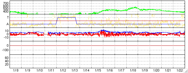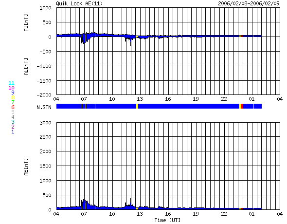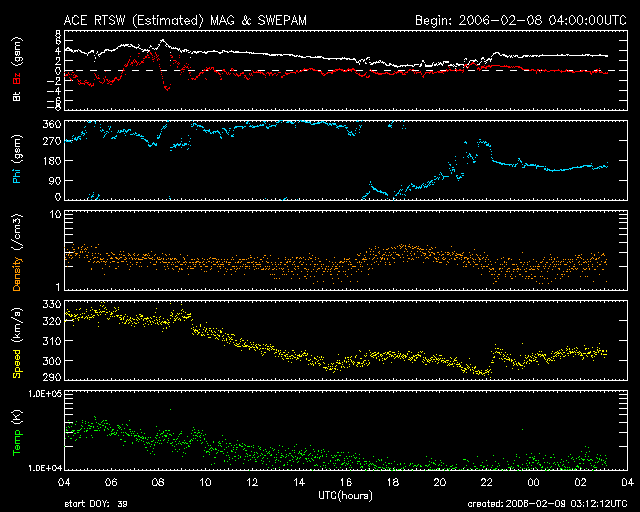 SOHO衛星のMDIカメラによる太陽黒点 (c) SOHO (ESA & NASA) ![]() GOES衛星の太陽X線データ (c) NOAA/SEC ![]() ACEが観測した太陽風の磁場(1番上の枠、白線は全体の強度、赤線は南北成分) および、太陽風の密度(3番目の橙線)、速度(4番目の黄線) (c) NOAA/SEC ![]() シベリアで観測された3日間の磁場データ 右側の3分の1が、昨日のデータになります。グラフが上がったり下がったりすると、オーロラ活動が活発化しています。 (c) NICT ![]() リアルタイムAE指数 下段のAEグラフの値が高くなると、オーロラ活動が活発化しています。 (c) 京都大学, NICT ![]() 27日の太陽周期に合わせたデータプロット (太陽風版) 太陽が同じ面を地球に向けていた27日前の変化から、今後を予想することができます。 (c) NICT