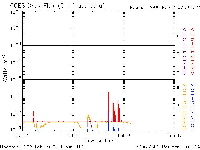 2006/ 2/ 9 12:13 更新 太陽、太陽風、磁気圏まで、宇宙天気はとても穏やかです。 担当 篠原 太陽のフレア活動、地球周辺の太陽風、地球の磁気圏と静かな状態が続いています。 太陽では、写真には写っていませんが、ほぼ中心にとても小さく852黒点群が発生した様です。 X線のグラフに針のように細長いまたたきが数本見えていますが、 このとても小さなフレア(周りが穏やかなのでものすごく目立っています)のいくつかは、 852黒点群で発生しています。 黒点群の規模はまだとても小さいので、太陽は穏やかな状態が続くでしょう。 一方、地球に到達している太陽風も、とても穏やかです。 速度は300km/秒程度まで下がっています。 磁場強度も弱く、3nT前後です。 シベリア磁場を見ても、AE指数を見てもオーロラの活動はほとんど起こっていませんでした。 ACEの図で、水色の線が上の端から下の端へ跳んでいます。 これは、太陽風磁場の大まかな方向が切り替わる、セクター境界を越えたためと思われます。 太陽風の磁場は「地球から太陽向き」から「太陽から地球向き」に切り替わりました。 27日周期の図を見ると、1日早まっていますが、前周期でも同じ頃にセクターの切り替わりが発生しています。 (初め上に上がって、2日経って下に下がっています) SOHO EIT284のコロナホールの位置と、このセクター境界の変化を考慮すると、 太陽風速度の上昇もいくらか早まって、明日には見え始めるかもしれません。 そのSOHO EIT284の太陽写真を見ると、コロナホールがやや西に行き過ぎた所に見えています。 ここから吹き出した高速の太陽風が現在地球に向かっていると思われます。 今日の初めの一行で、「地球周辺の太陽風が静か」という書き方をしましたが、 それは、このコロナホールから飛び出した高速風は既に太陽から地球へ向かっているからです。 コロナホールは小規模ですので、太陽風の乱れは大きなものにはならないと予想されます。 SOHO衛星のEIT284カメラの映像 (c) SOHO (ESA & NASA)