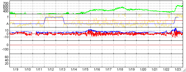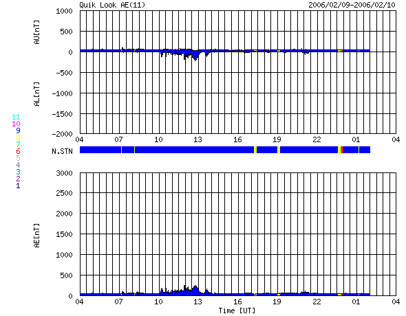 ACEが観測した太陽風の磁場(1番上の枠、白線は全体の強度、赤線は南北成分) および、太陽風の密度(3番目の橙線)、速度(4番目の黄線) (c) NOAA/SEC ![]() リアルタイムAE指数 下段のAEグラフの値が高くなると、オーロラ活動が活発化しています。 (c) 京都大学, NICT ![]() シベリアで観測された3日間の磁場データ 右側の3分の1が、昨日のデータになります。グラフが上がったり下がったりすると、オーロラ活動が活発化しています。 (c) NICT ![]() 27日の太陽周期に合わせたデータプロット (太陽風版) 太陽が同じ面を地球に向けていた27日前の変化から、今後を予想することができます。 (c) NICT