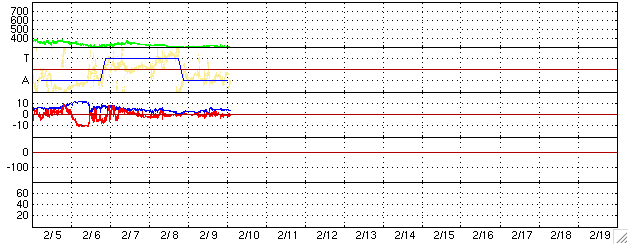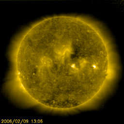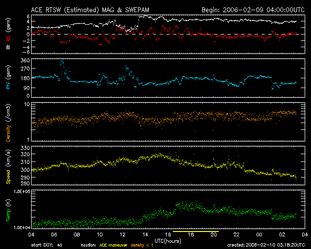 2006/ 2/10 12:19 更新 太陽風は低速で(320km/秒)、磁気圏は穏やかです。これから速度の上昇が始まるでしょう。 担当 篠原 穏やかな状態が続いています。 太陽風は速度300km/秒前後とかなり遅い状態で安定しています。 磁場強度が2nTから4nTに急に強まる変化が見られていますが、 たいした乱れではありません。 オーロラ活動に影響する太陽風磁場の南北成分は、ほとんど0付近にとどまっています。 このように太陽風はとても穏やかで、そのため、地球の磁気圏もとても穏やかです。 AE指数のグラフにはほとんど変化が見えていません。 シベリア磁場も完全に平らなままです。 昨日、一昨日のニュースで述べましたが、 これから、小規模のコロナホールによる太陽風の速度の上昇が発生しそうです。 27日周期の図を参考にすると、今日か明日くらいに始まると思われます。 前回は乱れとしてはそれほど大きなものではなく、500km/秒に上がる程度でした。 今周期も同程度の変化が見られるのではないでしょうか。 太陽のフレア活動はとても穏やかです。 太陽写真に852黒点群の番号が付きましたが、黒点そのものは判別できません。 X線のグラフはほとんど変化がなくなっています。 SOHO衛星のEIT284カメラの映像 (c) SOHO (ESA & NASA)