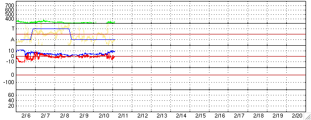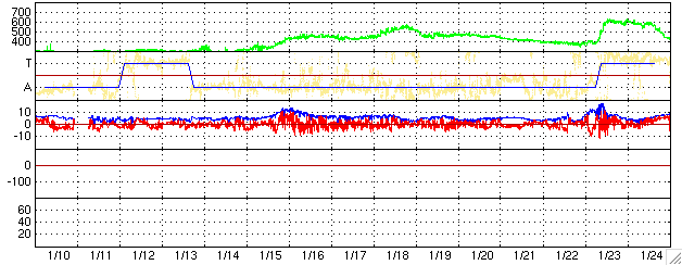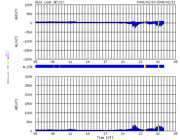 ACEが観測した太陽風の磁場(1番上の枠、白線は全体の強度、赤線は南北成分) および、太陽風の密度(3番目の橙線)、速度(4番目の黄線) (c) NOAA/SEC ![]() リアルタイムAE指数 下段のAEグラフの値が高くなると、オーロラ活動が活発化しています。 (c) 京都大学, NICT ![]() 27日の太陽周期に合わせたデータプロット (太陽風版) 太陽が同じ面を地球に向けていた27日前の変化から、今後を予想することができます。 (c) NICT
