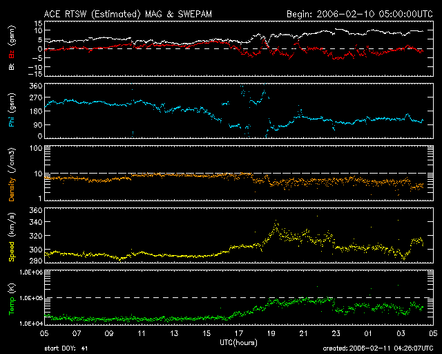 2006/ 2/11 13:27 更新 太陽風磁場が強まっています(10nT)。これから太陽風の速度が上昇しそうです。 担当 篠原 11日2時(世界時10日17時)ころより、太陽風に乱れが現れ始めました。 それまで4nT程度だった太陽風の磁場強度(ACEの白線)が、 ゆっくりと強まり、10nTに上がっています。 これは、太陽風の速度が上昇を始める時によく見られる変化です。 太陽風の速度は、今のところは300km/秒前後ととても遅いままです。 ただ、ACEの図の前半がとても安定していたのに比べて、 太陽風磁場が強まり始めた後半の部分では、不規則な変動が目立っています(小幅ですが)。 27日周期の図をご覧下さい。 前周期の1月15日のところに、今回と似た磁場強度(青線)の増加が見られています。 約1日変化の発生が早まっています。 ただ、前周期では磁場が強まり始めると同時に速度(緑色線)の高まりも始まっています。 今回はまだそれは見られず、このあとどのように変化が進むのか注目されます。 前回は、450〜550km/秒程度の高速風が5日程度続いています。 太陽風磁場の強まり以降、-5nTくらいの南向き磁場が比較的頻繁に続いています。 速度が遅いので、小規模にとどまっていますが、オーロラ活動がいくらか発生している様です。 AE指数のグラフでは200〜300nTくらいの小さな変化が現れ始めています。 現在の磁場の強まりが続いているうちに速度が上昇すれは、 オーロラの活動はずっと活発化するでしょう。 太陽では、852に続いて853の黒点群番号が付けられています。 しかし、ここに掲載している写真では黒点の姿を識別する事はできません。 とても小さな黒点群です。 フレア活動は現在もとても静かです。 一方、SOHO EIT284の太陽写真で、東の端(左端)から明るい領域が上がって来ています。 あまり大きくはなさそうですが、ここから新しい黒点群が姿を見せるかもしれません。 SOHO衛星のEIT284カメラの映像 (c) SOHO (ESA & NASA)