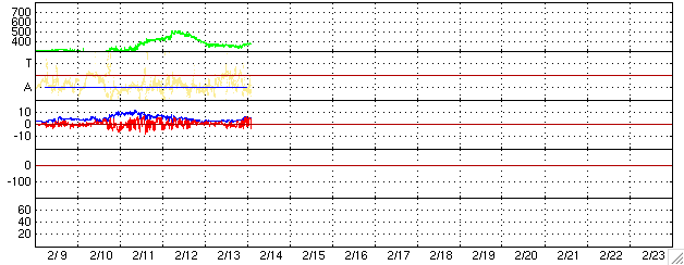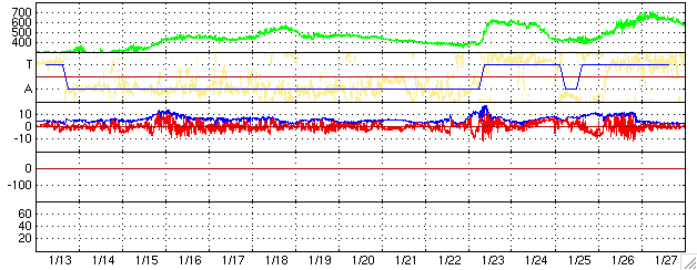 SOHO衛星のMDIカメラによる太陽黒点 (c) SOHO (ESA & NASA) ![]() GOES衛星の太陽X線データ (c) NOAA/SEC ![]() ACEが観測した太陽風の磁場(1番上の枠、白線は全体の強度、赤線は南北成分) および、太陽風の密度(3番目の橙線)、速度(4番目の黄線) (c) NOAA/SEC ![]() リアルタイムAE指数 下段のAEグラフの値が高くなると、オーロラ活動が活発化しています。 (c) 京都大学, NICT ![]() 27日の太陽周期に合わせたデータプロット (太陽風版) 太陽が同じ面を地球に向けていた27日前の変化から、今後を予想することができます。 (c) NICT