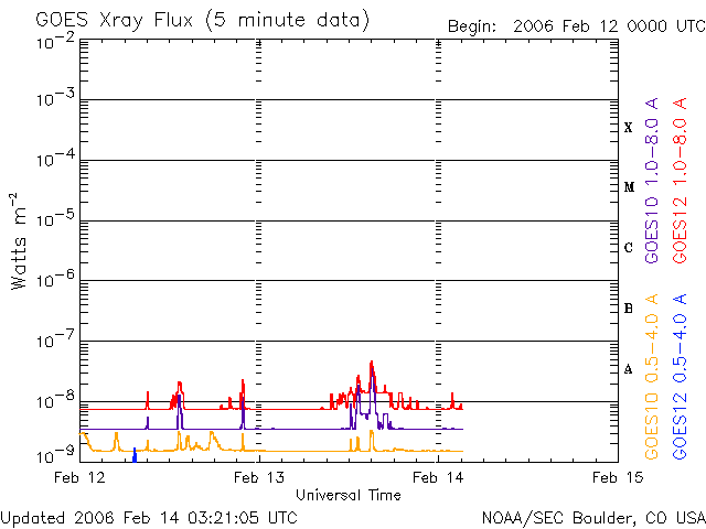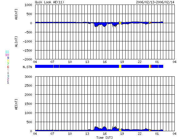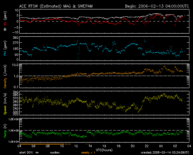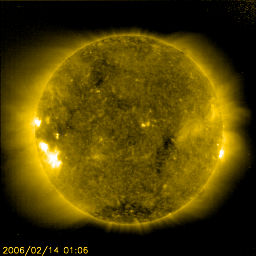 2006/ 2/14 12:25 更新 磁気圏は静穏です。太陽のフレア活動も穏やかです。 担当 篠原 宇宙天気は穏やかな状態が続いています。 太陽では、フレア活動は極めて小さな変化が観測されているだけで、とても穏やかです。 SOHO EIT284の太陽写真で、東端(左端)付近に明るい部分が現れています。 黒点写真では、このあたりに白く白斑の姿を見ることができます。 小さく、黒点の様な点も見えますので、 明日あたりは黒点群として識別されているかもしれません。 太陽風は、速度370km/秒くらいの通常の速度でほぼ安定しています。 3nTくらいに弱まっていた太陽風磁場が、再び5nTに強まっています。 強さとしては普通のレベルなのですが、この磁場強度の変化に続いて、 太陽風の速度に変化が現れるかもしれません(大きく変化することはないでしょう)。 磁気圏の活動も概ね穏やかです。 AE指数のグラフでは、小さな変化が見えていますが、ほとんどの時間では静穏です。 太陽風の磁場が強度を戻していますので、今後、これが南向きの傾向になると、 小規模のオーロラ活動が見られるようになるでしょう。 SOHO衛星のEIT284カメラの映像 (c) SOHO (ESA & NASA)