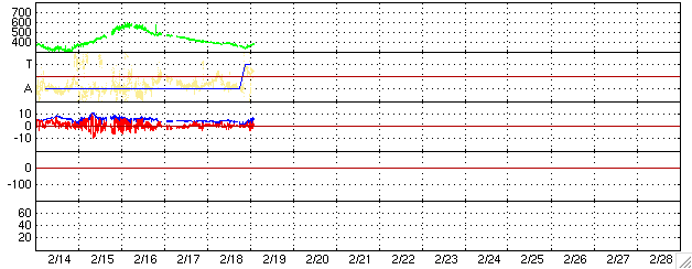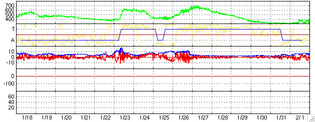 ACEが観測した太陽風の磁場(1番上の枠、白線は全体の強度、赤線は南北成分) および、太陽風の密度(3番目の橙線)、速度(4番目の黄線) (c) NOAA/SEC ![]() リアルタイムAE指数 下段のAEグラフの値が高くなると、オーロラ活動が活発化しています。 (c) 京都大学, NICT ![]() 27日の太陽周期に合わせたデータプロット (太陽風版) 太陽が同じ面を地球に向けていた27日前の変化から、今後を予想することができます。 (c) NICT