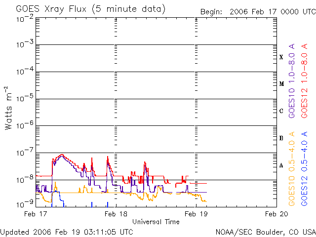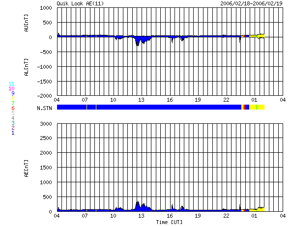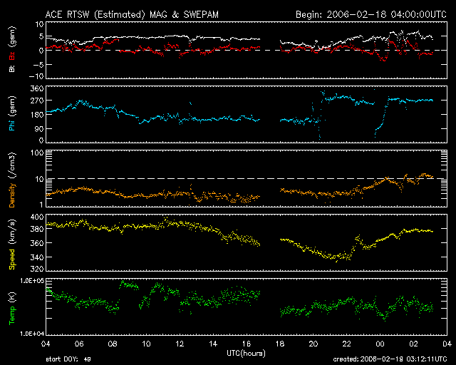 (c) NOAA/SEC ![]() ACEが観測した太陽風の磁場(1番上の枠、白線は全体の強度、赤線は南北成分) および、太陽風の密度(3番目の橙線)、速度(4番目の黄線) (c) NOAA/SEC ![]() | ||||||||||||||||||||||||||||||||||||||||||||||||||||||||