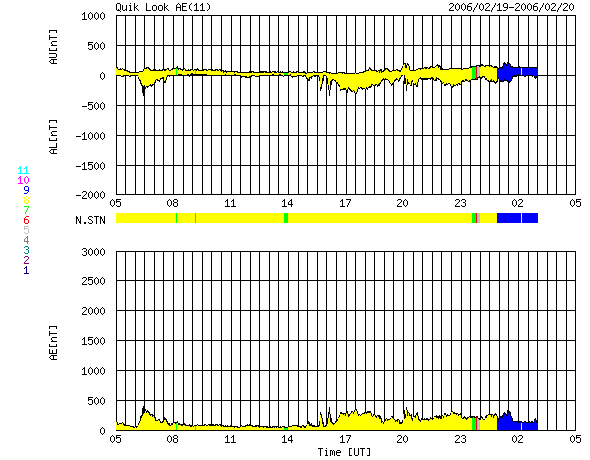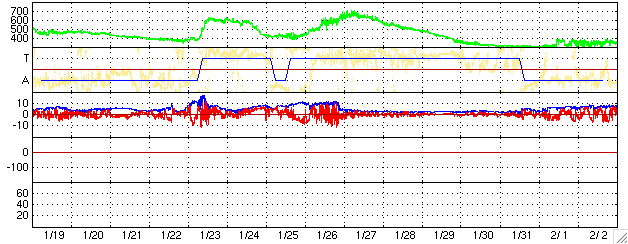 ACEが観測した太陽風の磁場(1番上の枠、白線は全体の強度、赤線は南北成分) および、太陽風の密度(3番目の橙線)、速度(4番目の黄線) (c) NOAA/SEC ![]() リアルタイムAE指数 下段のAEグラフの値が高くなると、オーロラ活動が活発化しています。 (c) 京都大学, NICT ![]() 27日の太陽周期に合わせたデータプロット (太陽風版) 太陽が同じ面を地球に向けていた27日前の変化から、今後を予想することができます。 (c) NICT
