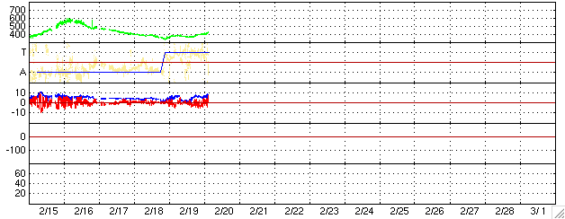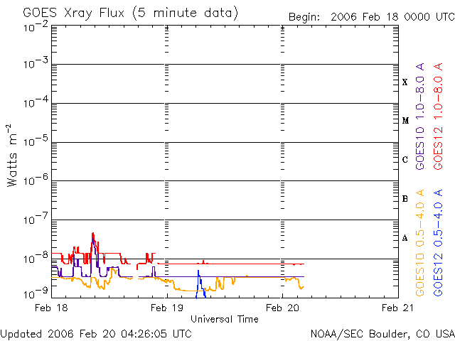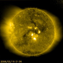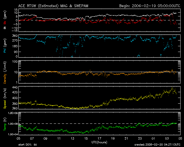 2006/ 2/20 13:28 更新 昨夜より、太陽風の速度が上昇を始めました(420km/秒)。引き続き上昇しそうです。 担当 篠原 昨日のニュースで、太陽風の速度が上昇を始めたようだと記しましたが、 結局、上昇は380mk/秒までで止まり、その後360km/秒に下がるという変化になりました。 そして、昨夜、20日2時(19日17時)から再び速度の上昇が始まりました。 現在は420km/秒に達していて、上昇の傾向は続いています。 27日周期の図を見ると、太陽風の変化パターンが前周期とはいくらか変わっている様です。 しかし、SOHO EIT284に見えるコロナホールの分布としては、 ちょうど地球の影響位置(右半球に半分出たあたり)に達していますので、 現在速度が上がっているということは理解できる変化です。 まだたいした速さではありませんが、速度が上昇を始めたということと、 -2nT程度と弱いながらも太陽風で南向き磁場が続いているため、小規模の磁気圏活動が連続しています。 AE指数の図では、速度上昇が始まった図の後半で、300nT程度の活動を見る事ができます。 太陽はとても静穏です。 X線のグラフは、最低レベルに下がっていて、1日ほぼ平らと言っていい状態になっています。 黒点群は番号は付けられていますが、実際には無黒点になっているようです。 可視光ではいつもと変わらない太陽ですが、宇宙天気の目で見ると、とても静かな状態が続いています。 SOHO衛星のEIT284カメラの映像 (c) SOHO (ESA & NASA)