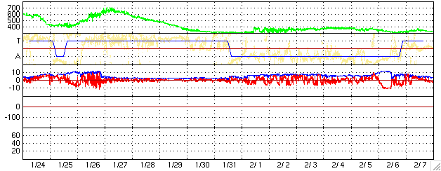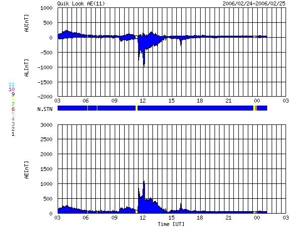 ACEが観測した太陽風の磁場(1番上の枠、白線は全体の強度、赤線は南北成分) および、太陽風の密度(3番目の橙線)、速度(4番目の黄線) (c) NOAA/SEC ![]() リアルタイムAE指数 下段のAEグラフの値が高くなると、オーロラ活動が活発化しています。 (c) 京都大学, NICT ![]() 27日の太陽周期に合わせたデータプロット (太陽風版) 太陽が同じ面を地球に向けていた27日前の変化から、今後を予想することができます。 (c) NICT
