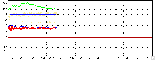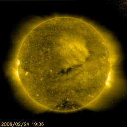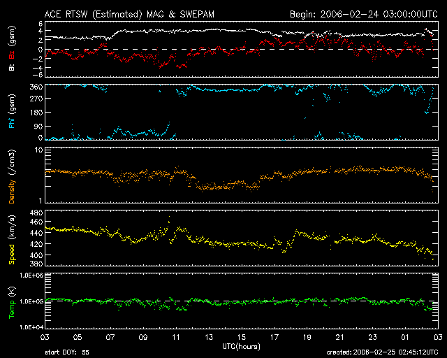 2006/ 2/25 11:47 更新 太陽風は次第に通常の速度に戻っています。穏やかな状態が続くでしょう。 担当 篠原 太陽風は、高速状態から次第に通常の速度にもどっています。 昨日は450km/秒くらいでやや高速でしたが、ゆっくりと低下の傾向を続けていて、 現在は420km/秒に下がっています。 高速風帯を抜けて、穏やかな太陽風になっています。 太陽風の磁場強度は3nTとやや弱め。 ACEの図の前半に-2〜-4nTのまとまった南向きが発生しています。 この影響で、500nTから瞬間的に1000nTに達するオーロラ活動が発生しています。 それ以外の時間帯では、南向き磁場が見られることがあまり無く、オーロラ活動は低調です。 27日周期の図を参考にすると、 日本時間で今日から明後日の27日くらいまではとても穏やかな太陽風が続きそうです。 27日の夜か、28日くらいから太陽風磁場に乱れが発生して、 磁気圏活動がいくらか活発化する可能性があります。 それは、SOHO EIT284の太陽写真で中心付近に見えている、 小さなコロナホールと関係するのだと思います。 放射線帯の高エネルギー電子は高いレベルを保っています。 変化としては減少の方向に向いています。 このままゆっくりと減少して、警戒ラインを割ることになるでしょう。 太陽は無黒点のままです。 穏やかな状態が続いています。 SOHO衛星のEIT284カメラの映像 (c) SOHO (ESA & NASA)