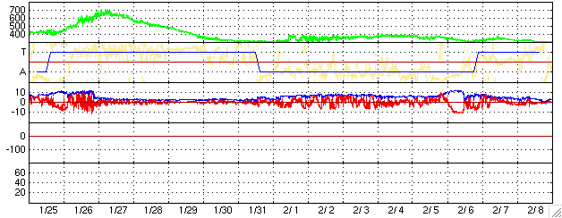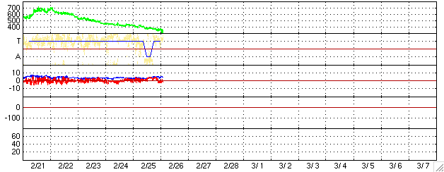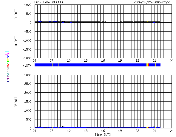 ACEが観測した太陽風の磁場(1番上の枠、白線は全体の強度、赤線は南北成分) および、太陽風の密度(3番目の橙線)、速度(4番目の黄線) (c) NOAA/SEC ![]() リアルタイムAE指数 下段のAEグラフの値が高くなると、オーロラ活動が活発化しています。 (c) 京都大学, NICT ![]() 27日の太陽周期に合わせたデータプロット (太陽風版) 太陽が同じ面を地球に向けていた27日前の変化から、今後を予想することができます。 (c) NICT