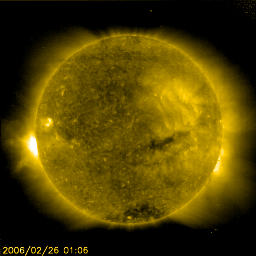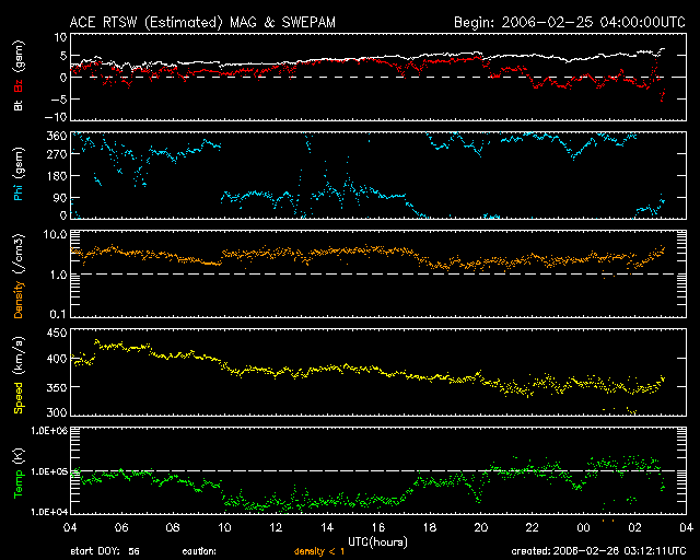 2006/ 2/26 12:14 更新 太陽風速度は低速(350km/秒)になっています。太陽風磁場の乱れが始まるかもしれません。 担当 篠原 太陽風の速度は更に低下を続け、350km/秒と低速状態になっています。 一方、3nTまで下がっていた太陽風の磁場強度は、 増加する傾向に変わり、現在は6nTに達しています。 27日周期の図から、明日以降と予想していた太陽風の(小規模の)乱れの、 始まりが見えている可能性もあります。 ここまでは、磁場の南北成分が北寄り傾向に推移していたこともあり、 磁気圏のオーロラ活動はとても穏やかで、AE指数には全く変化が見えていません。 しかし、今日のACEの図の最後の部分では、-2nTくらいの太陽風磁場南向きの乱れが見えています。 これから、前周期(1月31日以降)の様な太陽風磁場の乱れが続くとすると、 (速度が遅いため)小規模ですがオーロラ活動もある程度活発になるでしょう。 放射線帯の高エネルギー電子はやや減少していますが、警戒レベルをまだ保っています。 もうしばらく注意が必要です。 太陽のフレア活動は穏やかです。 現在も無黒点の状態が続いています。 SOHO EIT284の太陽写真を見ると、東端が明るくなっています。 新しい活動領域が上がってきそうです。 SOHO衛星のEIT284カメラの映像 (c) SOHO (ESA & NASA)