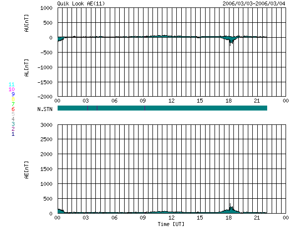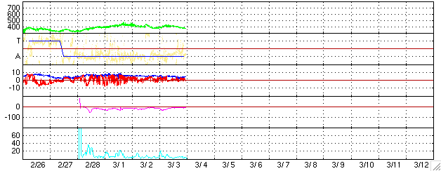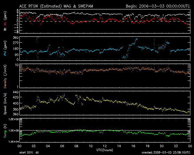 2006/ 3/ 4 08:59 更新 太陽風速度は380km/秒。磁気圏はとても穏やかです。 担当 篠原 宇宙天気は穏やかな状態が続いています。 太陽風は、速度が400km/秒から380km/秒にやや下がっています。 磁場強度は5nTと変わらず、南北成分も北寄り(プラス側)で推移しています。 このため、磁気圏の活動度はとても低く、 AE指数、シベリア磁場データともに、ほとんど変化は観測されていません。 27日周期の図によると、前周期のこの期間は、 もうしばらく太陽風磁場の変動が見られていたのですが、 今回はその乱れが短期間で終わっています。 このまま、穏やかな状態が続くのか、多少前周期の乱れが残っているのか、 明日くらいまでは注目されます。 その後は、9日くらいまで穏やかな状態が続くでしょう。 太陽は無黒点のままです。 太陽写真には856黒点群の番号がありますが、黒点そのものは見えていません。 X線画像では、この領域にいくらか明るさが残っていて、 GOES X線グラフで観測されている、小さな2つの盛り上がりは、この部分で起こっています。 ただし、とても小さな規模の活動です。 引き続き、太陽はとても穏やかでしょう。 ACEが観測した太陽風の磁場(1番上の枠、白線は全体の強度、赤線は南北成分) および、太陽風の密度(3番目の橙線)、速度(4番目の黄線) (c) NOAA/SEC ![]() リアルタイムAE指数 下段のAEグラフの値が高くなると、オーロラ活動が活発化しています。 (c) 京都大学, NICT ![]() シベリアで観測された3日間の磁場データ 右側の3分の1が、昨日のデータになります。グラフが上がったり下がったりすると、オーロラ活動が活発化しています。 (c) NICT ![]() 27日の太陽周期に合わせたデータプロット (太陽風版) 太陽が同じ面を地球に向けていた27日前の変化から、今後を予想することができます。 (c) NICT