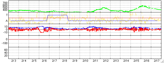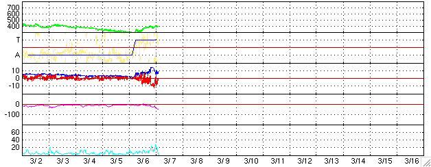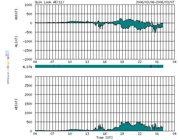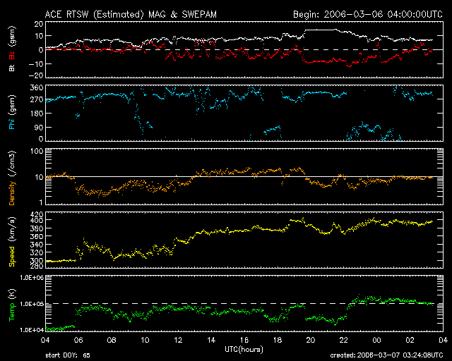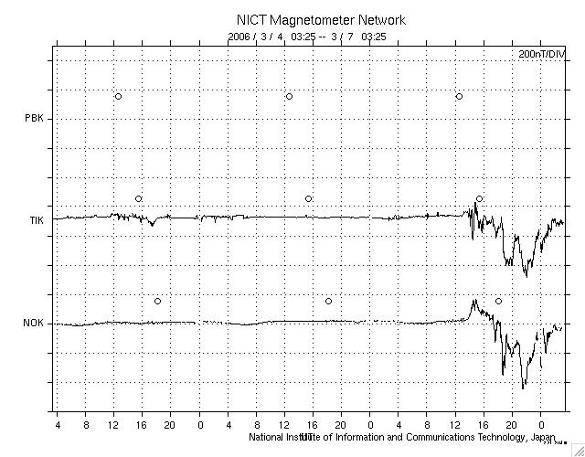 2006/ 3/ 7 12:26 更新 太陽風の磁場が大きく乱れ、南向きの影響でオーロラ活動が活発になりました。 担当 篠原 昨日の予想は見事に外れ、太陽風の磁場に乱れが発生しています。 6日13時(世界時6日4時)頃に、太陽風磁場のセクター境界が観測されました。 太陽風磁場の大まかな方向が、 「太陽から地球方向」から、「地球から太陽方向」へ変化したのです。 この変化自体は、宇宙天気に目立った影響は与えません。 しかし、この切り替わり以降、太陽風の様子が大きく変化したのです。 太陽風磁場の強度が急に強まり、10nTから、最大で15nTまで強まりました。 南北成分は、6日20時(世界時6日11時)から、南寄りに傾向が変わりました。 その直後から-5nTの南向きが続き、 磁場強度が15nTに達した7日4時半(世界時6日19時半)からは、 -10nTの強い南向きが約5時間にわたって続きました。 この間、太陽風の速度も上昇して、 それまでの300kkm/秒から、400km/秒近くまで上がりました。 ただ、高速というほどではなく、通常状態と言える程度の速度です。 南向き磁場が強まった結果、磁気圏の活動が活発になりました。 シベリアの磁場データを見ると、1000nTの幅の変化が観測されています。 一方、AE指数では、500nTとやや小規模の観測に留まっています。 ただし、これは現時点で収集されている観測データが少ないためではないでしょうか (図の色から判断すると、3観測点にとどまっている様です)。 シベリアの観測を参考にすると、 AE指数でも1000nT程度の変化が観測されている可能性があると思います。 また、沖縄の磁場データは、静穏レベルから-50nTほど低下する変化が見えています。 強い南向きの影響で、弱い磁気嵐が発生していると思われます。 今回の磁気圏活動は、活発ですが、大きなものにはなりませんでした。 それは、速度が400km/秒と、高速にはならなかったためです。 現在の太陽風は、速度は400km/秒のままですが、磁場強度は7nTくらいに弱まっています。 そして、南北成分は南寄りから、北寄りに変わりつつある様です。 このまま北寄りで安定すると、磁気圏の活動はおとなしくなるでしょう。 また、今回の太陽風の乱れは、それほど長くは続かず、 明日くらいにかけて次第に収まって行くのではないかと思います。 続いて、太陽の状況ですが、フレア活動はとても穏やかです。 掲載している写真では見つけることができませんが、 黒点群は856、857群ととても小さな黒点群が2つあるそうです。 こちらは、穏やかな状態がつづくでしょう。 ACEが観測した太陽風の磁場(1番上の枠、白線は全体の強度、赤線は南北成分) および、太陽風の密度(3番目の橙線)、速度(4番目の黄線) (c) NOAA/SEC ![]() シベリアで観測された3日間の磁場データ 右側の3分の1が、昨日のデータになります。グラフが上がったり下がったりすると、オーロラ活動が活発化しています。 (c) NICT ![]() リアルタイムAE指数 下段のAEグラフの値が高くなると、オーロラ活動が活発化しています。 (c) 京都大学, NICT ![]() 沖縄の磁場擾乱 下へ下がるほど、擾乱が発達している事を意味します。 (c) NICT ![]() 27日の太陽周期に合わせたデータプロット (太陽風版) 太陽が同じ面を地球に向けていた27日前の変化から、今後を予想することができます。 (c) NICT