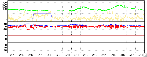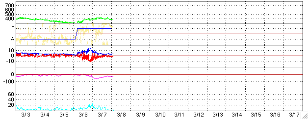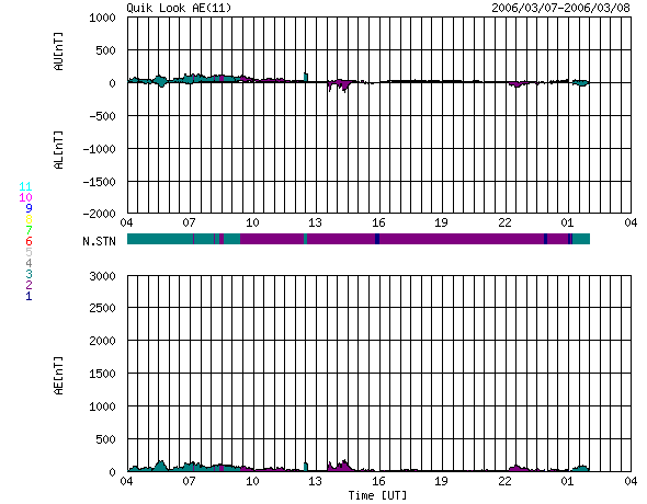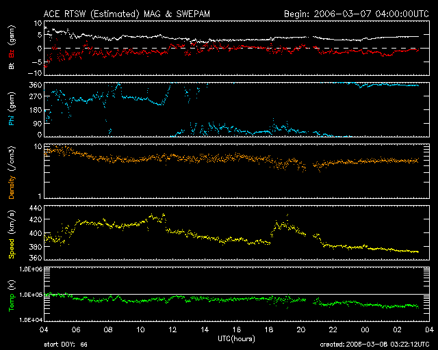 2006/ 3/ 8 12:23 更新 太陽風磁場の乱れは終わり、磁気圏は穏やかになっています。太陽で小さな長時間型フレアが発生しました。 担当 篠原 一昨日の6日に始まった太陽風磁場の乱れですが、 昨日のニュース以降は磁場強度が4nT程度に弱まりました。 南北成分は引き続き南寄りの傾向が続いたのですが、その強さは-2nT前後に弱まり、 磁気圏への影響は小さくなりました。 太陽風の速度は400km/秒前後から、現在は370km/秒に下がっています。 今日のAE指数のグラフでは、使われている観測点の数が2〜3箇所に減っています。 従って、オーロラ活動の図としては注意して見る必要があります。 しかし、シベリアの磁場データのグラフや、その他のデータも参考にして考えると、 磁気圏は基本的に穏やかな状態に戻っている様です。 沖縄の磁場データは、昨日50nTほど下がった所から、緩やかに回復の傾向を示しています。 低緯度地上(沖縄)の磁場強度の弱まりは、地球の赤道面を囲むように流れる環電流によるものですが、 沖縄の磁場変化は、昨日の磁気圏擾乱で発達した環電流が、 ゆっくりと弱まっている様子を示しています。 太陽風の磁場強度は4nTに下がったままになっており、 磁気圏の乱れは一段落ついたと見てよいでしょう。 太陽風は今日から明日くらいまでは穏やかな状態が続きそうです。 27日周期の図を参考にすると、その後、コロナホールによる、 比較的小規模な高速風が到来すると思われます。 一方、太陽では、856黒点群で、8日1時(世界時7日16時)に長時間型の弱いフレアが発生しました。 GOESのX線グラフでは、Bクラスに達した程度ですが、9時間にわたる強度の増加が観測されています。 この影響で、CME(太陽ガスの放出現象)が発生している可能性があります。 SOHO衛星が観測の休止位置に来ていることもあり、現時点では詳細は分かりません。 発生箇所が太陽の中心から外れて西に行き過ぎていること、規模がかなり小さいことなどから、 CMEが飛び出していても、太陽風への目立った影響は見られないのではないでしょうか。 乱れが地球へ到来するとすると、日本時間で10日の朝くらいでしょうか。 上記のコロナホールの影響と重なってしまって、区別できない可能性が高そうです。 ACEが観測した太陽風の磁場(1番上の枠、白線は全体の強度、赤線は南北成分) および、太陽風の密度(3番目の橙線)、速度(4番目の黄線) (c) NOAA/SEC ![]() リアルタイムAE指数 下段のAEグラフの値が高くなると、オーロラ活動が活発化しています。 (c) 京都大学, NICT ![]() シベリアで観測された3日間の磁場データ 右側の3分の1が、昨日のデータになります。グラフが上がったり下がったりすると、オーロラ活動が活発化しています。 (c) NICT ![]() 沖縄の磁場擾乱 下へ下がるほど、擾乱が発達している事を意味します。 (c) NICT ![]() 27日の太陽周期に合わせたデータプロット (太陽風版) 太陽が同じ面を地球に向けていた27日前の変化から、今後を予想することができます。 (c) NICT