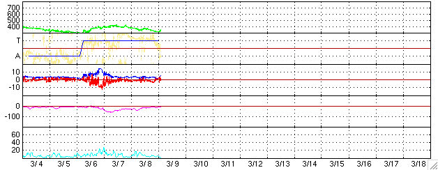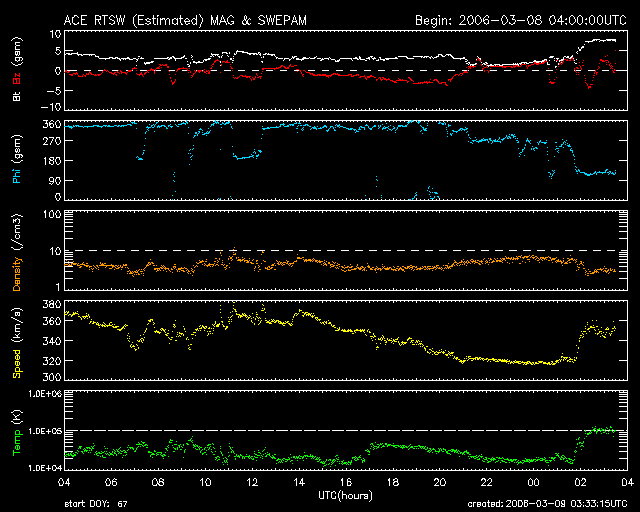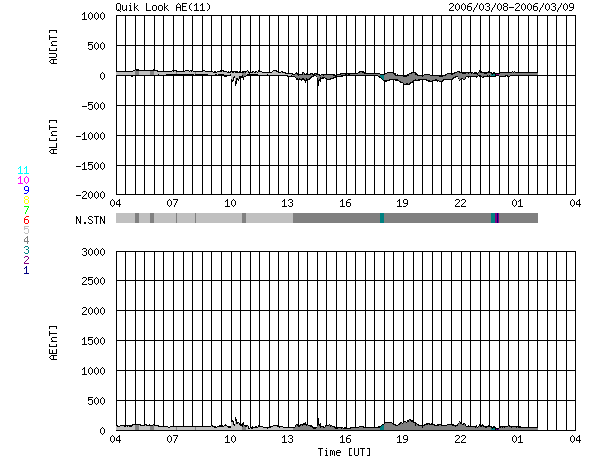 2006/ 3/ 9 12:35 更新 太陽風磁場のセクター境界が来ています。太陽風磁場に乱れが発生しています。 担当 篠原 昨日より、太陽風は概ね穏やかな状態でした(ACEの図)。 速度(黄色線)は低速で、360km/秒から320knm/秒へとゆっくり下がり、 磁場強度(白線)も3nT前後に弱まっていました。 南北成分(赤線)は南寄りの傾向が続いていましたが、 磁場強度が弱いために、南を向いても-2nT程度で、 太陽風の速度が遅いことと重なって、地球の磁気圏への影響は小さなものでした。 シベリア磁場データ、AE指数のグラフともに、小さな変化が見られている程度です。 小規模の磁気嵐が見られていた沖縄の磁場データも、静穏レベルにほぼ回復しています。 一方、ACEの図の最新の部分(右端)では、乱れが観測されています。 27日周期の図より、太陽風磁場のセクター境界が来ることが予想されていましたが、 その変化がちょうど見られている様です。 水色の線が上側から下側へ移動しています。 太陽風磁場の大まかな向きが、 「地球から太陽向き」から「太陽から地球向き」に切り替わりつつあるのです。 ただし、この変化そのものは磁気圏への影響はほとんどありません。 ポイントは、この変化に前後して太陽風が変動することがしばしば見られることです。 2〜3日前に発生した太陽風磁場の乱れも、セクター境界の直後に発生しました。 現在、太陽風は磁場強度が8nTくらいに強まっています。 これに伴って、短時間ですが-5nTの南向きが発生したりしています。 磁場強度が強まったことによって、強めの南向きになる可能性があります。 速度が遅いので、大きな擾乱になることはありませんが、磁気圏がいくらか活動的になるかもしれません。 また、27日周期の図を参考にすると、 コロナホールによる高速風が明日くらいから到来すると予想されます。 それに先立って太陽風磁場の乱れが見られると思われますが、 現在の変化はその乱れが早まったものかもしれません。 これからの太陽風の変化に注目して下さい。 太陽のフレア活動は発生していません。 黒点群は856、857の2つが示されていますが、どちらもとても小さな規模です。 このまま穏やかな状態が続くでしょう。 ACEが観測した太陽風の磁場(1番上の枠、白線は全体の強度、赤線は南北成分) および、太陽風の密度(3番目の橙線)、速度(4番目の黄線) (c) NOAA/SEC ![]() シベリアで観測された3日間の磁場データ 右側の3分の1が、昨日のデータになります。グラフが上がったり下がったりすると、オーロラ活動が活発化しています。 (c) NICT ![]() リアルタイムAE指数 下段のAEグラフの値が高くなると、オーロラ活動が活発化しています。 (c) 京都大学, NICT ![]() 沖縄の磁場擾乱 下へ下がるほど、擾乱が発達している事を意味します。 (c) NICT ![]() 27日の太陽周期に合わせたデータプロット (太陽風版) 太陽が同じ面を地球に向けていた27日前の変化から、今後を予想することができます。 (c) NICT