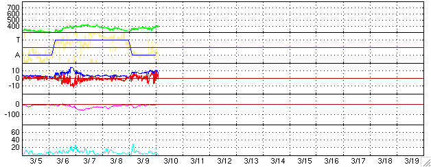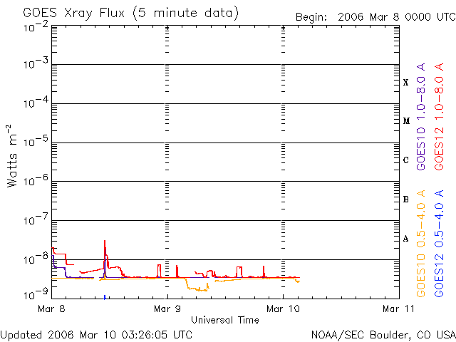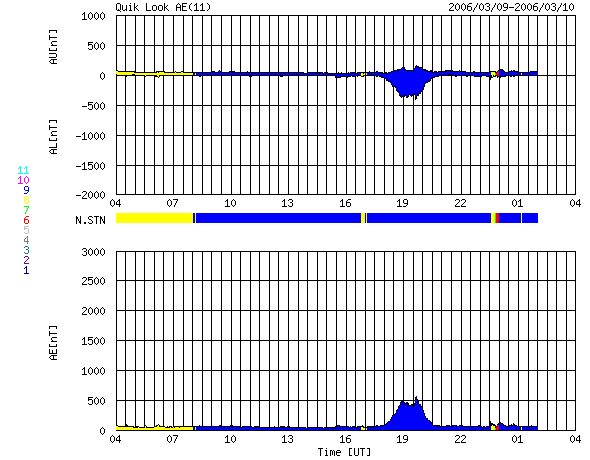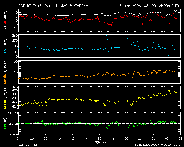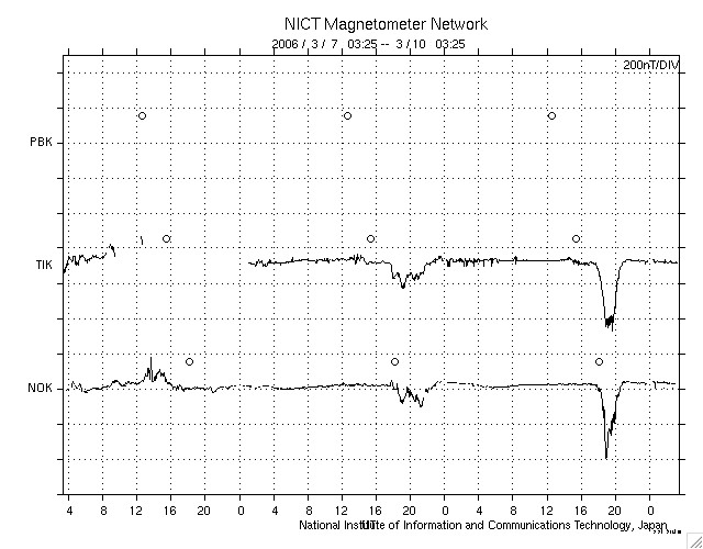 2006/ 3/10 12:28 更新 地球は回帰性の高速風領域に入りつつある様です。現在は磁気圏は静穏です。 担当 篠原 太陽風は、磁場強度が8nTとやや強まった状態が続いていましたが、 南北成分が北寄りの傾向だったため、磁気圏にはあまり大きな影響がありませんでした。 AE指数のグラフとシベリアの磁場データを見ると、 10日4時(世界時9日19時)のところに、火山の様な山形(谷型?)の変化がひとつだけ発生しています。 これは、ACEの図で、10日2-3時(世界時9日17-18時)に-5nTの南向きが発生したことによる変化です。 1時間ほどずれがあるのは、ACE衛星に当たった太陽風が地球に達するまでに時間がかかることと、 太陽風の変化が地球の磁気圏に目立つ変化を与えるまでに時間がかかることが関係しています。 ACEの最新の部分(右端)を見ると、太陽風は磁場強度が10nTを越えるくらいに上がり、 速度も380km/秒から420km/秒に高まっています。 27日周期の図で2月11-12日に見えている、 小規模の高速風領域が回帰しつつあるのではないかと思います。 速度の上昇と、南向き磁場の発生によって、磁気圏の活動が強められる可能性があります。 (現在は、磁場は北寄りが続いています) 太陽はとても穏やかです。 フレア活動は全く発生していません。 ACEが観測した太陽風の磁場(1番上の枠、白線は全体の強度、赤線は南北成分) および、太陽風の密度(3番目の橙線)、速度(4番目の黄線) (c) NOAA/SEC ![]() リアルタイムAE指数 下段のAEグラフの値が高くなると、オーロラ活動が活発化しています。 (c) 京都大学, NICT ![]() シベリアで観測された3日間の磁場データ 右側の3分の1が、昨日のデータになります。グラフが上がったり下がったりすると、オーロラ活動が活発化しています。 (c) NICT ![]() 27日の太陽周期に合わせたデータプロット (太陽風版) 太陽が同じ面を地球に向けていた27日前の変化から、今後を予想することができます。 (c) NICT