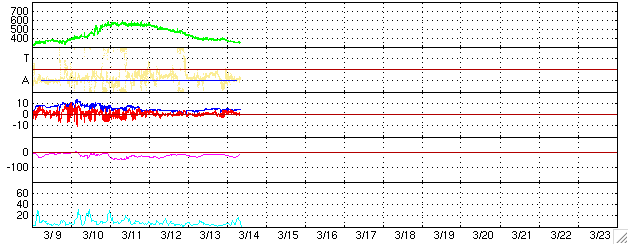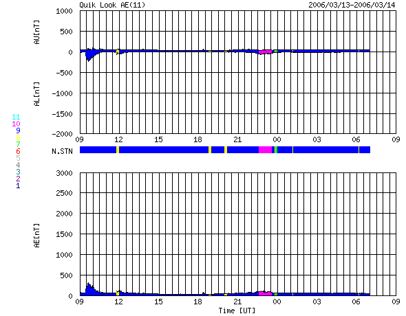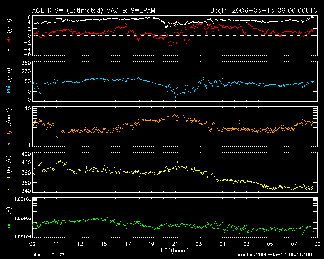 2006/ 3/14 17:42 更新 太陽風は速度が下がり(350km/秒)、磁気圏も穏やかです。まだ次の高速風は来ていません。 担当 篠原 今日の更新が遅くなり、申し訳ありませんでした。 太陽風は速度が340km/秒に下がり、低速になっています。 磁場強度は4nTと普通の強さです。 27日周期の図より、これから次の高速風帯に入りそうだと書いていましたが、 いまのところその変化は見えていません。 太陽風の速度が上昇する時には、磁場強度が先に強まることがよくあります。 この後のACEデータの磁場強度にも注目してください。 太陽風磁場の南北成分は、0nTから、北寄りに推移しています。 このため、磁気圏はとても穏やかです。 AE指数にはほとんど変化が観測されていません。 次の高速風領域に入るまでは、現在の様な穏やかな状態が続くでしょう。 太陽写真には、中心のやや上に858黒点群が小さく見えています。 X線のグラフを見ると、Bクラスのとても小さな短時間型のフレアがひとつ見えています。 これは、858群とは別の、東端に近い場所で発生したものです。 こちらにも黒点群ができつつあるのでしょうか。 ACEが観測した太陽風の磁場(1番上の枠、白線は全体の強度、赤線は南北成分) および、太陽風の密度(3番目の橙線)、速度(4番目の黄線) (c) NOAA/SEC ![]() 27日の太陽周期に合わせたデータプロット (太陽風版) 太陽が同じ面を地球に向けていた27日前の変化から、今後を予想することができます。 (c) NICT