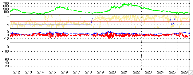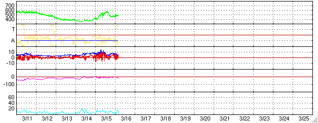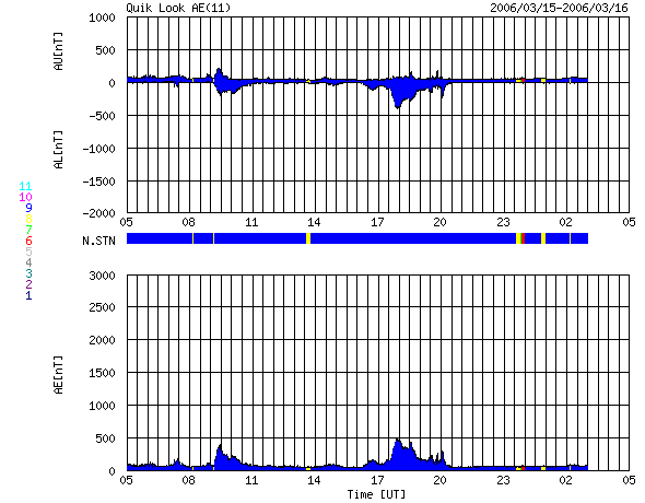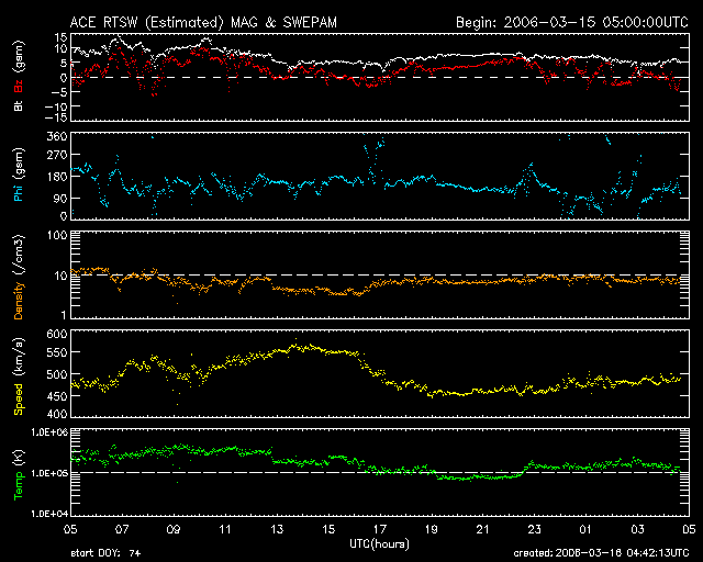 2006/ 3/16 13:44 更新 550km/秒の高速風が来ました。現在もやや高速が続いています。磁気圏は概ね静穏です。 担当 篠原 昨日、太陽風磁場強度の強まりをお伝えしましたが、 その後、速度が上昇を続け、15日23時(世界時15日14時)頃に550km/秒に達しました。 最高速の状態は長くは続かず、2〜3時間経ったところで低下に転じ、 現在にかけて450〜500km/秒とやや高速の状態で推移しています。 磁場強度は10nTに強まっていましたが、速度が最高に達した頃に5nTに弱まっています。 磁気圏への影響を決める磁場の南北成分は、概ね北寄りの傾向を示しています。 ただ、図の真ん中付近、16日1時(世界時15日16時)頃に、 1時間ほど-3nTくらいの弱い南向きが発生しています。 ここでは速度も高まっていたため、一時的にオーロラ活動が強まりました。 AE指数で500nT、シベリアの磁場データを見ると1000nT近い活発な活動が、 短時間ですが発生しています。 27日周期の図を見ると、前周期の高速風帯が半日ほど遅れて到達したのだという事が分かります。 この後、速度はゆっくりと下がっていくでしょう。 南向き磁場によって、小規模のオーロラ活動が発生するかもしれませんが、 基本的には穏やかな状態が続くと思われます。 そして、3日後の19日から、次の高速風が地球へやってくると予想されます。 前周期の、2月20日に始まる高速風の回帰です。 この時の高速風は、最高で700km/秒に達しています。 太陽写真が更新されていないため、新しい写真は掲載していません。 昨日から更に新しく861黒点群が発生したとのことです。 詳細は分かりませんが、規模は小さいと思われます。 X線のグラフでは、Aクラスのところで小刻みの変動が観測されています。 これは、太陽の西の端(右端)に没しつつある859黒点群が起こしている変化です。 周りが静かなので目立っていますが、規模はとても小さなものです。 ACEが観測した太陽風の磁場(1番上の枠、白線は全体の強度、赤線は南北成分) および、太陽風の密度(3番目の橙線)、速度(4番目の黄線) (c) NOAA/SEC ![]() リアルタイムAE指数 下段のAEグラフの値が高くなると、オーロラ活動が活発化しています。 (c) 京都大学, NICT ![]() シベリアで観測された3日間の磁場データ 右側の3分の1が、昨日のデータになります。グラフが上がったり下がったりすると、オーロラ活動が活発化しています。 (c) NICT ![]() 27日の太陽周期に合わせたデータプロット (太陽風版) 太陽が同じ面を地球に向けていた27日前の変化から、今後を予想することができます。 (c) NICT