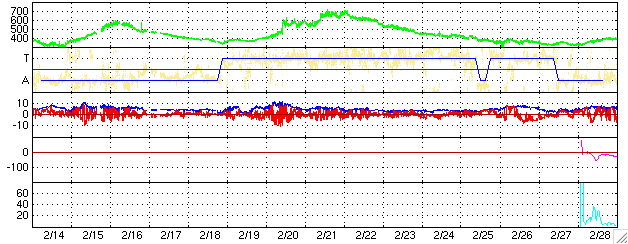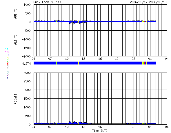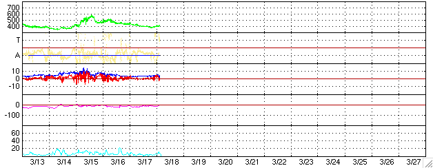 2006/ 3/18 12:58 更新 太陽風は通常の速度で,磁気圏は静穏です。 担当 篠原 宇宙天気は、穏やかな状態が続いています。 太陽風は速度400km/秒前後と通常の速度でほぼ安定しています。 磁場強度は4nT前後で、こちらも通常の強さです。 南北成分は0nTを挟んで、小さく南北に揺れる程度でした。 AE指数のグラフを見るとほとんど変化は無く、 磁気圏ではオーロラ活動はほとんど見られていません。 太陽は27日で一周します。 従って、コロナホールなど太陽の磁場構造に影響される太陽風の変化は、 27日の周期で繰り返す傾向があります。 この様子を見るために用いるのが、27日周期の図です。 この図を見ると、前周期の2月20日(図は世界時です)からコロナホールによる高速風(緑色線)が来ています。 今周期に対応させると、明日、3月19日から速度が上がり始めると予想されます。 太陽風の周期性はあくまで目安であって、周期毎に太陽の様子は変化しますし、 高速風の到来も早くなったり遅くなったりします。 今日から注目するべきでしょう。 太陽風の速度が上昇を始めるときには、磁場強度が強まることがよくあります。 27日周期の図のIMFとある青線が磁場強度(Bt)です。 前周期のデータでも、2月19日から磁場強度の上昇が発生しています。 今回も同様の経過をたどると予想されますので、ACEの図の磁場強度にも注目してください。 IMFの赤線は南北成分(Bz)です。 こちらがマイナスになることが、磁気圏活動が活発になるための条件です。 磁場強度が強まるとともにこの成分がマイナス(南)を向くと、オーロラの活動が活発になります。 活発の度合いは、速度と南向き磁場の強さに関係します。 太陽のフレア活動はとても穏やかです。 黒点群は、860、861群のふたつが存在しています。 写真では、太陽の中心のやや左に、ほんのかすかに黒点がひとつ小さく見えています。 これは860群です。 861群はその左下にあるのですが、この写真では識別できません。 ACEが観測した太陽風の磁場(1番上の枠、白線は全体の強度、赤線は南北成分) および、太陽風の密度(3番目の橙線)、速度(4番目の黄線) (c) NOAA/SEC ![]() リアルタイムAE指数 下段のAEグラフの値が高くなると、オーロラ活動が活発化しています。 (c) 京都大学, NICT ![]() 27日の太陽周期に合わせたデータプロット (太陽風版) 太陽が同じ面を地球に向けていた27日前の変化から、今後を予想することができます。 (c) NICT
