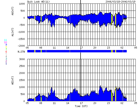 2006/ 3/19 13:33 更新 高速太陽風がやってきました。現在の速度は650km/秒。弱い磁気嵐が発生しています。 担当 篠原 昨日のニュース直後の、18日17時(世界時18日8時)から太陽風の速度が上昇しました。 速度は、400km/秒から500km/秒に短時間に上がり、10時間ほどその状態が続きました。 そして、再び緩やかな上昇が始まって、現在は650km/秒に上がっています。 昨日のニュースで詳しく検討しましたが、前周期と比較すると1日ほど早く高速風が到来しました。 一方、太陽風磁場の強度も10nT近くに強まっています。 地球磁気圏への影響を決定する南北成分(赤線)を見ると、 南寄りの時間がかなり続いています。 時に-10nTと大きく南を向いたことと、速度が高まっている事とがくみ合わさって、 磁気圏への影響はかなり大きくなっています。 オーロラの活動を示すAE指数のグラフは、久しぶりに活発になっています。 ほぼ一日に渡って1000nT前後の活動が続いています。 磁気圏の活発な活動ぶりは、シベリアの磁場デーテでも見ることができます。 一方、低緯度にある沖縄の磁場データを見ると、 磁場強度(赤線)が、静穏時のレベル(青の横線)から-70nT程度下へ下がっています。 これは、地球を囲むように流れる環電流が発達していることを意味しています。 小規模ですが、磁気嵐が発生しています。 前周期を参考にすると、高速風は4日ほど続くでしょう。 高速風が続いている間は、太陽風磁場が南を向くとオーロラが活発になります。 太陽風は、速度としては最高速に達していると思われます。 その場合、磁場強度はこれから弱まっていくでしょう。 そして、南向き磁場も小幅に留まるようになり、磁気圏の活動度は弱まっていきます。 太陽のフレア活動は穏やかです。 ACEが観測した太陽風の磁場(1番上の枠、白線は全体の強度、赤線は南北成分) および、太陽風の密度(3番目の橙線)、速度(4番目の黄線) (c) NOAA/SEC ![]() リアルタイムAE指数 下段のAEグラフの値が高くなると、オーロラ活動が活発化しています。 (c) 京都大学, NICT ![]() シベリアで観測された3日間の磁場データ 右側の3分の1が、昨日のデータになります。グラフが上がったり下がったりすると、オーロラ活動が活発化しています。 (c) NICT ![]() 沖縄の磁場擾乱 下へ下がるほど、擾乱が発達している事を意味します。 (c) NICT ![]() GOES衛星の太陽X線データ (c) NOAA/SEC ![]() | |||||||||||||||||||||||||||||||||||||||