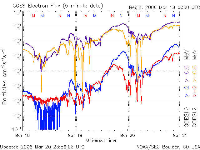 2006/ 3/21 12:37 更新 高速風領域は後半に入っています(600km/秒)。放射線帯の高エネルギー電子が増加しています。 担当 篠原 高速太陽風と活発な磁気圏活動が続いています。 昨日より700km/秒とかなり速い状態が継続していました。 このあたりが最高速の領域だった様です。 日付が変わった21日1時(世界時20日16時)頃から速度がゆっくりと低下を始めました。 現在は600km/秒に下がっています。 しかし、依然高速の状態です。 太陽風の磁場は強度は5nT前後で普通の強さです。 しかし、南北成分の南寄りが続いていて、磁気圏活動にエネルギーを与え続けています。 南向き磁場の振幅は-2〜-3nT程度で比較的小さいのですが、 速度が高い事で磁気圏が活動的になっています。 AE指数を見ると、500〜800nTの変化が一日中見えています。 シベリアの磁場データも3日間乱れ続けています。 低緯度の沖縄の磁場データは、 静穏レベル(青の横線)から-50nTほど下がったところを保っていて、 弱い磁気嵐も継続しています。 さて、今回の高速太陽風領域も後半に入りました。 EIT284の太陽写真では、今回の高速風の原因となったコロナホールが 西の端(右端)に沈みつつあります。 27日周期の前周期の変化の様子から、 これから2日ほどかけて速度は通常の値に戻っていくのではないでしょうか。 速度が高い間は、南向き磁場によって磁気圏の活動が活発になります。 放射線帯の高エネルギー電子の密度は一段と高まっています。 GOES10(青線)に続いて、GOES12(赤線)も警戒ラインの10の4乗を越えています。 衛星の運用では注意が必要でしょう。 この状態は数日に渡って続くと思われます。 太陽では、写真に番号が付いていませんが、中心付近に862黒点群が見えています。 規模に目立った変化はありません。 X線のグラフでは、小さな変動は観測されていますが、目立った活動ではありません。 太陽は静穏な状態が続くでしょう。 SOHO衛星のEIT284カメラの映像 (c) SOHO (ESA & NASA)