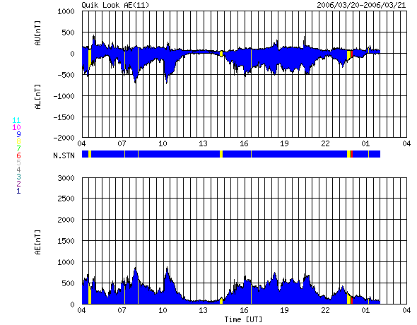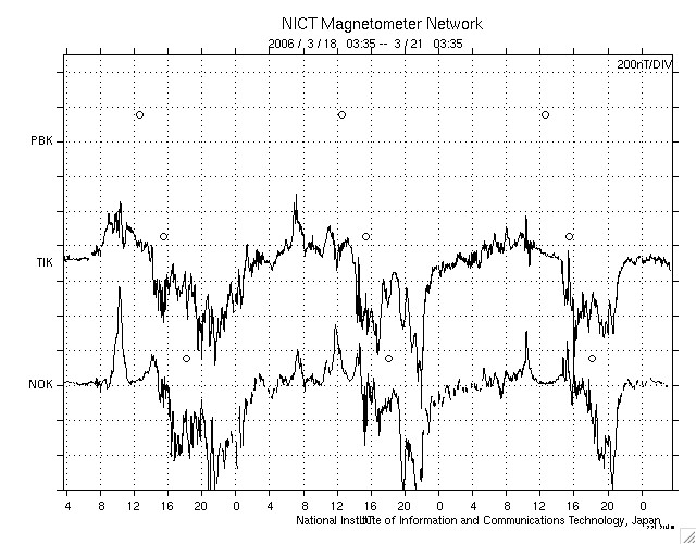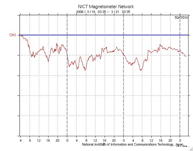 ACEが観測した太陽風の磁場(1番上の枠、白線は全体の強度、赤線は南北成分) および、太陽風の密度(3番目の橙線)、速度(4番目の黄線) (c) NOAA/SEC ![]() リアルタイムAE指数 下段のAEグラフの値が高くなると、オーロラ活動が活発化しています。 (c) 京都大学, NICT ![]() シベリアで観測された3日間の磁場データ 右側の3分の1が、昨日のデータになります。グラフが上がったり下がったりすると、オーロラ活動が活発化しています。 (c) NICT ![]() 沖縄の磁場擾乱 下へ下がるほど、擾乱が発達している事を意味します。 (c) NICT ![]() 27日の太陽周期に合わせたデータプロット (太陽風版) 太陽が同じ面を地球に向けていた27日前の変化から、今後を予想することができます。 (c) NICT