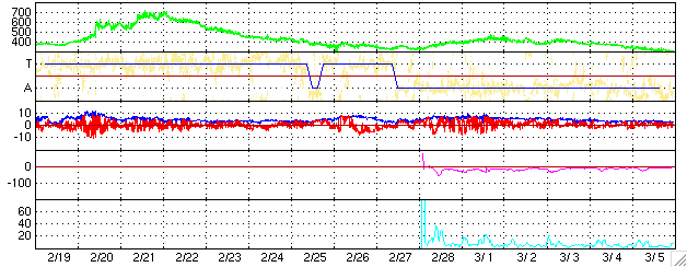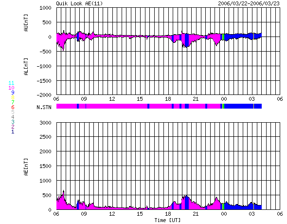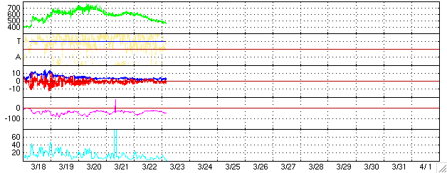 ACEが観測した太陽風の磁場(1番上の枠、白線は全体の強度、赤線は南北成分) および、太陽風の密度(3番目の橙線)、速度(4番目の黄線) (c) NOAA/SEC ![]() リアルタイムAE指数 下段のAEグラフの値が高くなると、オーロラ活動が活発化しています。 (c) 京都大学, NICT ![]() シベリアで観測された3日間の磁場データ 右側の3分の1が、昨日のデータになります。グラフが上がったり下がったりすると、オーロラ活動が活発化しています。 (c) NICT ![]() 27日の太陽周期に合わせたデータプロット (太陽風版) 太陽が同じ面を地球に向けていた27日前の変化から、今後を予想することができます。 (c) NICT