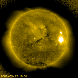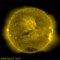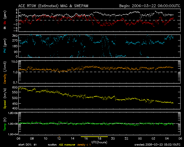 2006/ 3/23 14:05 更新 太陽風の速度は低下して450km/秒に下がっています。862黒点群の活動も弱まっています。 担当 篠原 地球は高速の太陽風領域から抜け出しつつあります。 昨日のニュースの後、太陽風の速度は低下傾向に入り、 約1日かけて、600km/秒から450km/秒へと下がりました。 ほぼ通常の速度か、やや速いという程度の速度です。 磁場強度も2〜3nTまで弱まっています。 北に寄ったり南に寄ったり、ゆったりとした変化をしていて、 その結果、南を向いた時間帯に(図の後半)、小規模のオーロラ活動を起こしています。 AE指数で500nTを切る程度の規模の変動です。 今後も太陽風は速度の低下が続き、磁気圏は穏やかな状態になるでしょう。 SOHO EIT284の太陽写真を、最新のもの(左)と、27日前のもの(右)で比較してみましょう。 どちらがどちらなのか、気にしなくてもいいほど良く似ています。 唯一、急に活動が現れた862黒点群の周辺が明るくなっている程度です(西の端付近)。 従って、今後の太陽風の変化も、27日前と同様の変化になるのではないでしょうか。 そう考えると、今後は基本的には太陽風の速度が遅めの穏やかな状態が続きそうです。 SOHO EIT284には細長いコロナホールが見えていますが、大きな影響はなさそうです。 2月26日と、2月28日以降に太陽風の磁場に乱れが見られ、 その影響で小規模の磁気圏活動が発生している様です。 同様の活動が見られるかもしれません。 放射線帯の高エネルギー電子は高いレベルが続いています。 ゆっくり減衰する性質がありますので、しばらく注意が必要でしょう。 急に小規模フレアを起こして注目された862黒点群ですが、規模が縮小している様です。 今日の太陽写真では、注意しないと気付かない見え方になっています。 X線のグラフも落ち着いていて、変化が乏しくなっています。 太陽のフレア活動は穏やかな状態になりそうです。 SOHO衛星のEIT284カメラの映像 (c) SOHO (ESA & NASA)