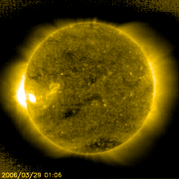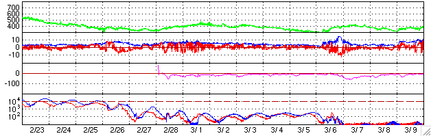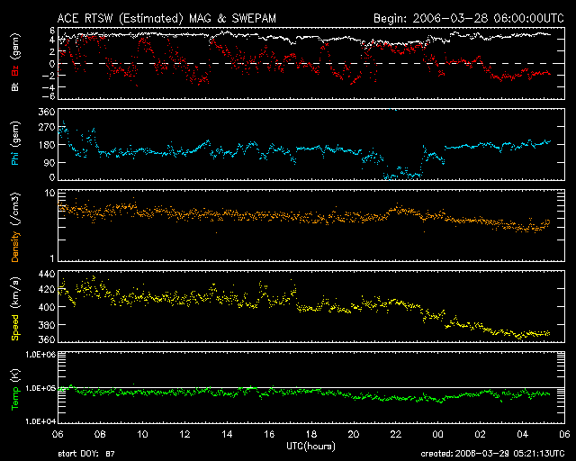 2006/ 3/29 14:21 更新 太陽風、磁気圏ともに静穏な状態が続いています。 担当 北村 昨日より、太陽風の速度がやや上昇し、430km/秒まで上昇しました。 その後は、速度は安定し、本日やや減少傾向にあります。 太陽風の南向き成分はときおり南向きと北向を繰り返していますが、 磁場の強さ自体が弱いために、大きな磁気圏の擾乱にはいたっていません。 AE指数のグラフを見ると、オーロラ活動が非常に静穏な状態であったことが 分かります。 SOHOのEIT284の画像を見ると、向かって左の端(西の端)から明るい領域 (10865)が現れてきています。また、南側にやや暗い領域(コロナホール) が現れてきています。今後、磁気圏に影響を与えるかどうか注目する 必要がありそうです。 ただし、前周期の状態を見ますと、この先1週間程度は比較的静穏な 状態が続きそうです。 SOHO衛星のEIT284カメラの映像 (c) SOHO (ESA & NASA)