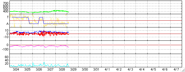 ACEが観測した太陽風の磁場(1番上の枠、白線は全体の強度、赤線は南北成分) および、太陽風の密度(3番目の橙線)、速度(4番目の黄線) (c) NOAA/SEC ![]() SOHO衛星のMDIカメラによる太陽黒点 (c) SOHO (ESA & NASA) ![]() リアルタイムAE指数 下段のAEグラフの値が高くなると、オーロラ活動が活発化しています。 (c) 京都大学, NICT ![]() シベリアで観測された3日間の磁場データ 右側の3分の1が、昨日のデータになります。グラフが上がったり下がったりすると、オーロラ活動が活発化しています。 (c) NICT ![]() 27日の太陽周期に合わせたデータプロット (太陽風版) 太陽が同じ面を地球に向けていた27日前の変化から、今後を予想することができます。 (c) NICT