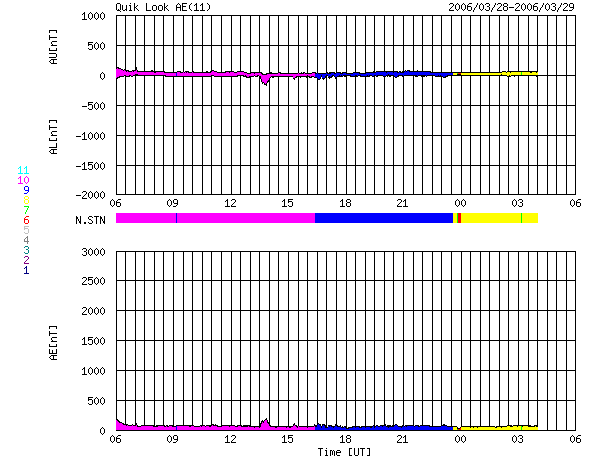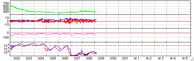 SOHO衛星のMDIカメラによる太陽黒点 (c) SOHO (ESA & NASA) ![]() ACEが観測した太陽風の磁場(1番上の枠、白線は全体の強度、赤線は南北成分) および、太陽風の密度(3番目の橙線)、速度(4番目の黄線) (c) NOAA/SEC ![]() リアルタイムAE指数 下段のAEグラフの値が高くなると、オーロラ活動が活発化しています。 (c) 京都大学, NICT ![]() シベリアで観測された3日間の磁場データ 右側の3分の1が、昨日のデータになります。グラフが上がったり下がったりすると、オーロラ活動が活発化しています。 (c) NICT ![]() 27日の太陽周期に合わせたデータプロット (太陽風版) 太陽が同じ面を地球に向けていた27日前の変化から、今後を予想することができます。 (c) NICT