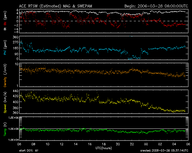 2006/ 3/29 14:38 更新 太陽風、磁気圏ともに静穏な状態が続いています。 担当 北村 太陽風速度は、昨日よりやや上昇して、430km/秒程度に達したあと、 本日よりやや減少傾向にあります。太陽風磁場の南北成分(赤い線) は、時々、北向と南向きを繰り返していますが、強さそのものは あまり大きくないために、磁気圏では大きなじょうらは発生していません。 AE指数のグラフを見るとオーロラ活動が非常に静穏なことが分かります。 SOHO EIT 284の画像を見ると、向かって左の端(西のリム)から明るい 領域(10865)が現れてきました。南側にはやや暗いコロナホールが 見えています。今後、磁気圏まで影響を与えるか注目が必要です。 ただし、前周期の状態を見ますと、これらの領域は、余り大きな影響を 与えていませんでしたので、この先1週間程度は静穏な状態が続く可能性 が大きいです。 SOHO衛星のEIT284カメラの映像 (c) SOHO (ESA & NASA)