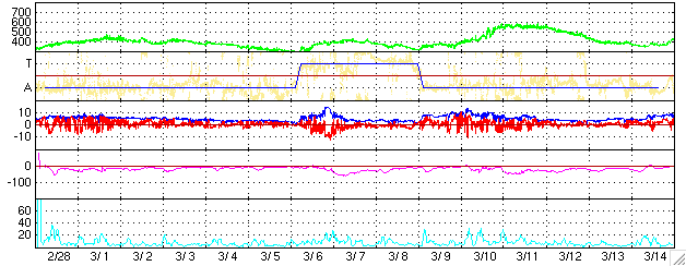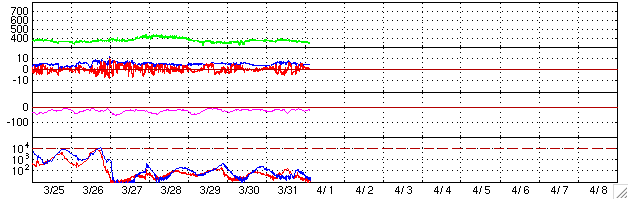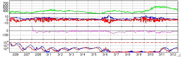 ACEが観測した太陽風の磁場(1番上の枠、白線は全体の強度、赤線は南北成分) および、太陽風の密度(3番目の橙線)、速度(4番目の黄線) (c) NOAA/SEC ![]() リアルタイムAE指数 下段のAEグラフの値が高くなると、オーロラ活動が活発化しています。 (c) 京都大学, NICT ![]() SOHO衛星のMDIカメラによる太陽黒点 (c) SOHO (ESA & NASA) ![]() GOES衛星の太陽X線データ (c) NOAA/SEC ![]() 27日の太陽周期に合わせたデータプロット (太陽風版) 太陽が同じ面を地球に向けていた27日前の変化から、今後を予想することができます。 (c) NICT