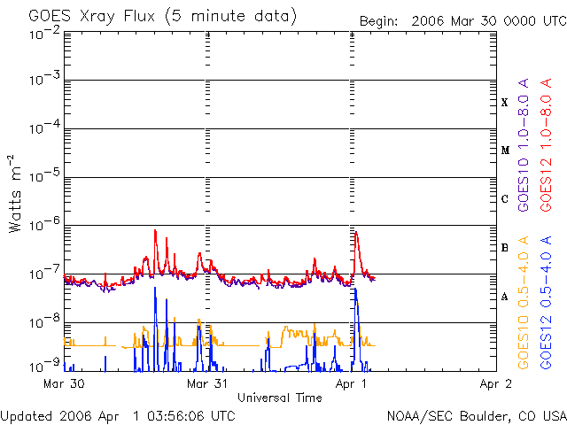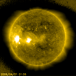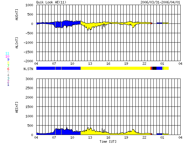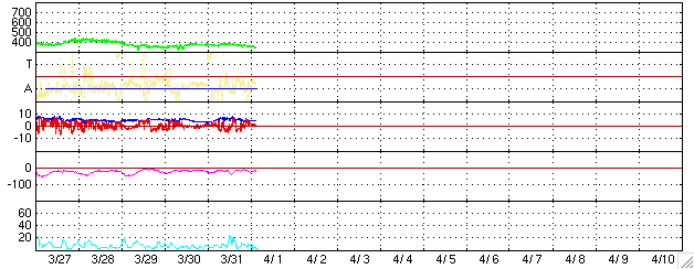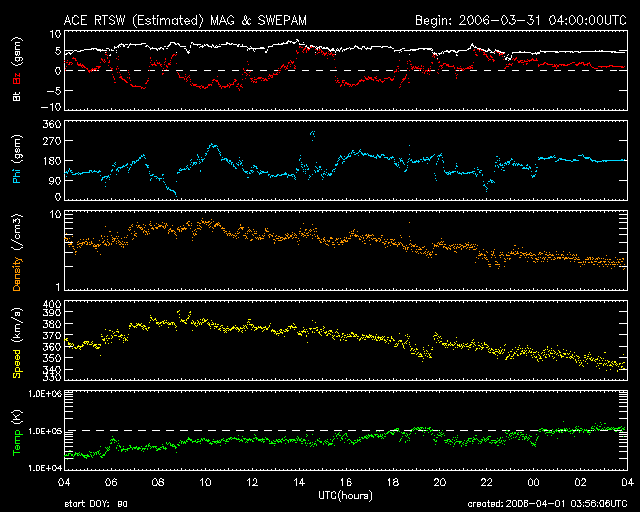 2006/ 4/ 1 12:57 更新 太陽風速度は、340km/秒まで減速、磁気圏は静穏です。 担当 北村 太陽風速度は、一時390km/秒まで上昇しましたが、その後再び減速を 初めて現在は、340km/秒程度まで減速しています。 太陽風磁場はやや強くなっており、磁場の南北成分(赤い線)は 5nT程度の南向きの状態を数時間ずつ繰り返していました。 AE指数のグラフを見ると、昨日に比べてオーロラの活動がやや活発に なっているのが分かりますが、これは、上述の太陽風磁場の南向き 成分が小規模なオーロラ嵐を連続的に引き起こしていたためと考え られます。 SOHO EIT284の画像を見ますと、明るい活動領域865,866が徐々に 正面に回ってきています。昨日に引き続き久しぶりに太陽フレア の活動がGOES衛星の太陽X線モニターで確認する事が出来ます。 ただし、強度はBクラスまでで、特に大きなX線フレアーは発生していません。 太陽風の27日周期のグラフより、あさって位から太陽風速度が上昇し、 磁気圏がやや荒れてくるのではないかと予想されます。 SOHO衛星のEIT284カメラの映像 (c) SOHO (ESA & NASA)