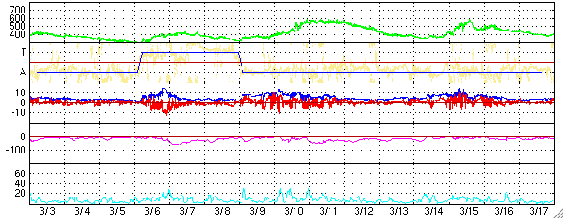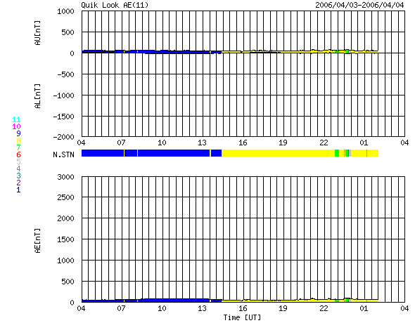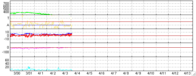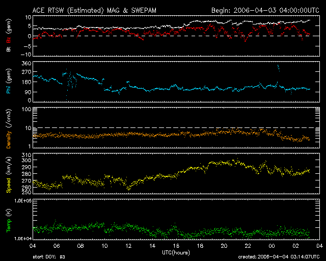 SOHO衛星のMDIカメラによる太陽黒点 (c) SOHO (ESA & NASA) ![]() GOES衛星の太陽X線データ (c) NOAA/SEC ![]() ACEが観測した太陽風の磁場(1番上の枠、白線は全体の強度、赤線は南北成分) および、太陽風の密度(3番目の橙線)、速度(4番目の黄線) (c) NOAA/SEC ![]() リアルタイムAE指数 下段のAEグラフの値が高くなると、オーロラ活動が活発化しています。 (c) 京都大学, NICT ![]() 27日の太陽周期に合わせたデータプロット (太陽風版) 太陽が同じ面を地球に向けていた27日前の変化から、今後を予想することができます。 (c) NICT