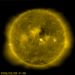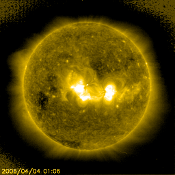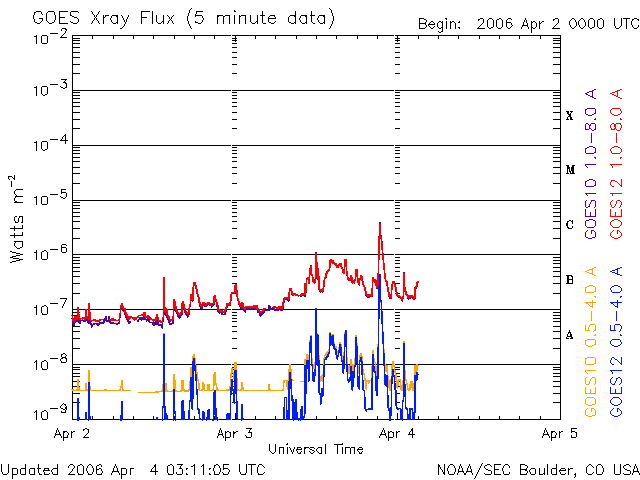 2006/ 4/ 4 12:15 更新 865、867黒点群が小規模フレアを起こしています。太陽風、磁気圏は静穏です。 担当 篠原 太陽で、865黒点群と867黒点群が発達して、やや活発な動きを見せています。 865黒点群は、今朝4日6時(世界時3日21時)に、C4の小規模フレアを起こしました。 867黒点群もC1の小さな小規模フレアを起こしています。 GOES衛星のX線動画を見ても、これらの黒点群は、 ちかちかと小さな瞬きを頻繁に起こしていて、活発さを感じさせます。 865群は中規模フレアを起こす可能性もあり、今後の活動に注意する必要があるでしょう。 一方、太陽風は穏やかな状態が続いています。 祖奥戸は250km/秒から300km/秒の間をゆっくりと変化していて、低速のままです。 磁場強度が4nTから7nTにやや上がっていますが、南北成分は北寄りを続けていて、 磁気圏への影響はほとんど見られません。 オーロラの活動を示すAE指数は、とても穏やかです。 ただ、磁場強度が強まっているので、ここで南寄りに変わると、 オーロラ活動をやや活発にする可能性があります (速度が遅いので、大きな活動にはならないでしょう)。 27日周期の図では、前周期と比較すると、 太陽風速度・磁場ともに変化の様子が変わっています。 (3月6-7日と、4月2-3日を比べてください) この図を見ると、明後日頃から太陽風の速度が上昇すると考えられますが、 どうなるでしょうか。 SOHO EIT284の太陽写真で過去の様子と比較すると、 2周期前(2月9日)の写真では、中央やや上にコロナホールが見えていて、 これが次の高速風の原因だったと思われます。 最新(4月4日)の写真では、このコロナホールは、 明るい黒点群の影響で、薄くなって見えています。 高速風の様子も変化するかもしれません。 SOHO衛星のEIT284カメラの映像 (c) SOHO (ESA & NASA)