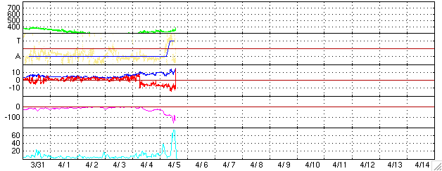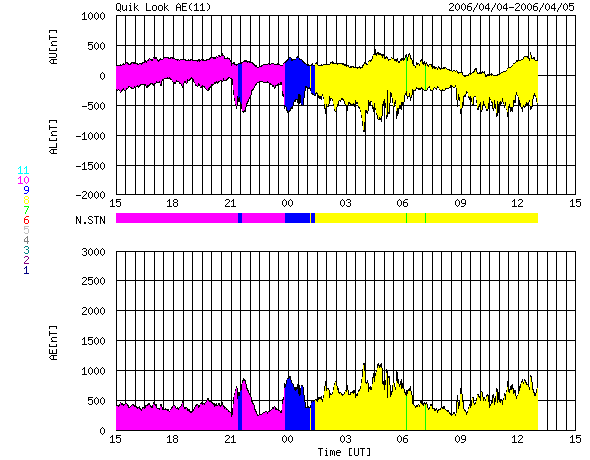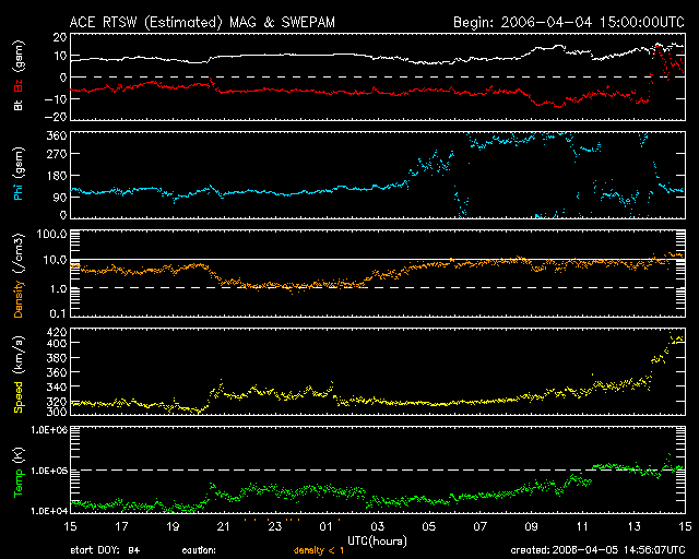 2006/ 4/ 5 23:57 更新 太陽風磁場が北を向きました。磁気圏の乱れはひとまず落ち着くでしょう。 担当 篠原 5日22時半(世界時5日13時半)に、太陽風磁場の南北成分が北向きに切り替わりました。 ACE衛星の観測ですので、地球へは約1時間後に届きます。 このため、これまで延々と続いていた磁気圏の乱れは一旦落ち着くことになります。 太陽風の様子を見ると、セクターの切り替わりや、速度の上昇などが見えています。 太陽風の状態そのものが変化していきそうです。 ここまで延々と長時間にわたって南向きが続いたため、 速度が遅いとはいえ磁気圏の活動はだいぶ活発になっていました。 AE指数の乱れは1000nTに達し、 沖縄の磁場データは-100nTを越える減少を示しています(最大で-150nT))。 速度が遅かったためにこの程度で済んだとも言えますし、 一方、速度が速ければ南向きはより短時間で終わるなど、 また違った展開になっていたとも考えられます。 引き続き今後の太陽風の変化に注目する必要がありますが、 ここまでの、特別な状態は終わりました。 (このニュースは速報です。前号の記事も参考にご覧下さい) ACEが観測した太陽風の磁場(1番上の枠、白線は全体の強度、赤線は南北成分) および、太陽風の密度(3番目の橙線)、速度(4番目の黄線) (c) NOAA/SEC ![]() リアルタイムAE指数 下段のAEグラフの値が高くなると、オーロラ活動が活発化しています。 (c) 京都大学, NICT ![]() 沖縄の磁場擾乱 下へ下がるほど、擾乱が発達している事を意味します。 (c) NICT ![]() 27日の太陽周期に合わせたデータプロット (太陽風版) 太陽が同じ面を地球に向けていた27日前の変化から、今後を予想することができます。 (c) NICT