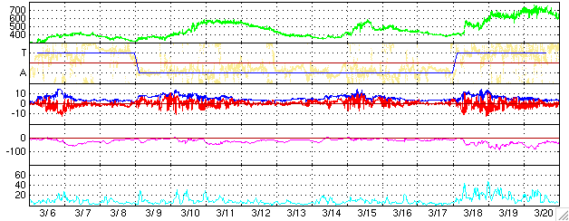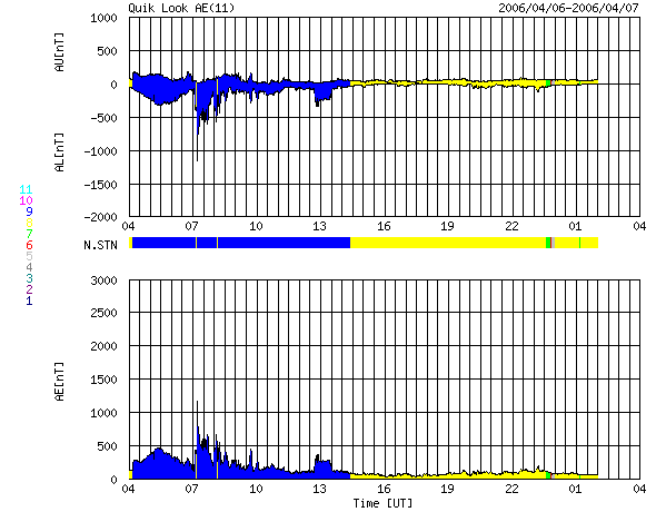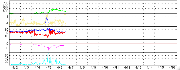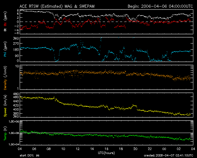 SOHO衛星のMDIカメラによる太陽黒点 (c) SOHO (ESA & NASA) ![]() GOES衛星の太陽X線データ (c) NOAA/SEC ![]() ACEが観測した太陽風の磁場(1番上の枠、白線は全体の強度、赤線は南北成分) および、太陽風の密度(3番目の橙線)、速度(4番目の黄線) (c) NOAA/SEC ![]() リアルタイムAE指数 下段のAEグラフの値が高くなると、オーロラ活動が活発化しています。 (c) 京都大学, NICT ![]() 27日の太陽周期に合わせたデータプロット (太陽風版) 太陽が同じ面を地球に向けていた27日前の変化から、今後を予想することができます。 (c) NICT