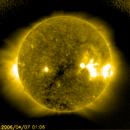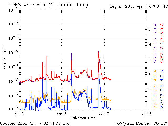 2006/ 4/ 7 12:42 更新 中規模フレアが2回発生しています。太陽風の速度は下がり、磁気圏は穏やかです。 担当 篠原 太陽面で一番西側(右側)に見えている865黒点群が、昨日から活発になっています。 6日14時半(世界時6日5時半)にM1.4、7日5時半(世界時6日20時半)にM1.2と、 2つの中規模フレアを起こしています。 X線のグラフを見ると2つめのM1.2は長時間型になっています。 この様なフレアの場合、CME(太陽ガスの放出現象)を伴うことがよく見られるのですが、 SOHOのLASCOカメラでは、今のところこれに相当するCMEは見えていません。 ただし、CMEが発生していたとしても横を向いているため、地球への影響はないでしょう。 865群は現在も同程度の規模を保っていて、引き続き中規模フレアへの注意が必要です。 また、太陽写真には新しく868黒点群の番号が付き、 東寄りには、869黒点群(まだ書かれていません)が発生しています。 更に、EIT284の太陽写真の東端が明るくなっていることから、 これから新しい活動領域が上がって来るかもしれません。 450km/秒とやや速度が上がっていた太陽風ですが、1日程度で速度が低下に向かっています。 昨日の昼以降はゆっくり低下を続けていて、既に380km/秒と、通常レベルに戻っています。 太陽風磁場は強度が3nT程度に弱まり、南北には2nT〜-2nT程度で変化していますが、 幅が小さいことと、速度が下がって来ているため磁気圏は概ね穏やかです。 AE指数の図も、後半は全く変化が見えていません。 SOHO EIT284の写真では、太陽の真ん中から下に向かって、 暗くコロナホールが広がっているのが見えます。 ここは太陽の磁場が外へ向かって広がっている場所で、 速度の高い太陽風が外へ向かって吹き出しています。 (そのために、周囲より暗く見えるのです) ちょうど今、太陽の中心で飛び出した太陽風が、3日後頃に地球にやってきます。 早ければ9日、本格的には10日頃から影響が現れるでしょう。 それまでは、太陽風、磁気圏ともに穏やかな状態が続くと思われます。 SOHO衛星のEIT284カメラの映像 (c) SOHO (ESA & NASA)