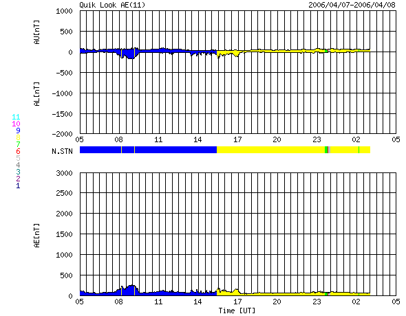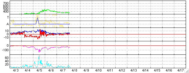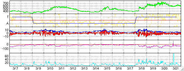 ACEが観測した太陽風の磁場(1番上の枠、白線は全体の強度、赤線は南北成分) および、太陽風の密度(3番目の橙線)、速度(4番目の黄線) (c) NOAA/SEC ![]() リアルタイムAE指数 下段のAEグラフの値が高くなると、オーロラ活動が活発化しています。 (c) 京都大学, NICT ![]() 27日の太陽周期に合わせたデータプロット (太陽風版) 太陽が同じ面を地球に向けていた27日前の変化から、今後を予想することができます。 (c) NICT