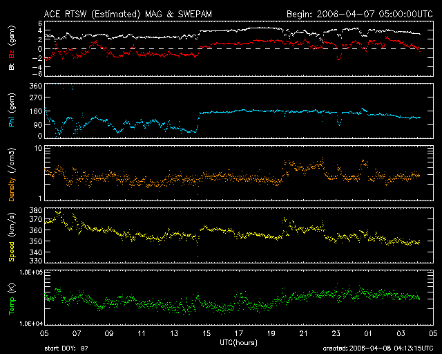 2006/ 4/ 8 13:15 更新 太陽風はやや遅く(350km/秒)、磁気圏は穏やかです。 担当 篠原 太陽風は、速度350km/秒とやや遅い状態です。 磁場強度は4nTで普通ですが、南北成分は2nT弱と小さな振幅になっています。 ACEの図の前半では、小さく南寄り(赤線がマイナス)になっていたため、 小さなオーロラ活動も発生していた様です。 オーロラ電流の強さを示すAE指数を見ると、図の前半で小さな変化が見えています。 ACEの図の後半では、太陽風磁場は北寄り(赤線がプラス)に変わったため、 AE指数も後半は全く変化がありません。 地球の磁気圏はとても静かになっています。 このまま明日にかけて、太陽風は低速で穏やかな状態が続くと予想されます。 磁気圏のオーロラ活動も穏やかなままでしょう。 その後、4月10日くらいからコロナホールによる、高速の太陽風が地球にやってきます。 SOHO EIT284の太陽写真を見てください。 太陽の中心のやや右寄り(西寄り)から、下側(南)に向かって暗い領域が広がっています。 これがコロナホールです。 ここから吹き出している速度の高い太陽風が、もう1〜2日程度で地球に達するでしょう。 太陽風の速度が上がり、磁場が強まって南を向くと、 オーロラが活発になったり、磁気嵐が発生します。 ただし、コロナホールとしては比較的小規模のものの様です。 太陽風の乱れも、それほど大きなものにはならないのではないかと思います。 太陽では、867黒点群でC9.7の大きめの小規模フレアが発生しています。 7日17時(世界時7日8時)です。 短時間型のもので、CME(太陽ガスの放出現象)はないでしょう。 ここしばらくにぎやかだった865、867の両黒点群はともに勢力を弱めています。 フレアを起こす可能性は下がっています。 869群に番号が書かれました。 ここはまだ目立ったフレア活動は起こしていません。 SOHO衛星のEIT284カメラの映像 (c) SOHO (ESA & NASA)